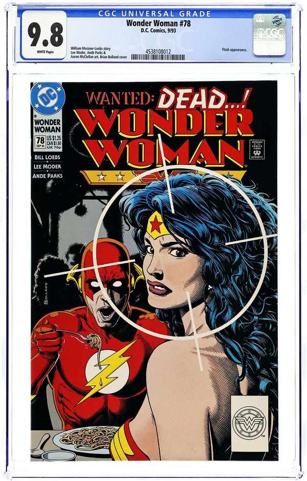 The Flash guest-stars! Mayfly, the international super-assassin in the employ of Ares Buchanan stalks Diana and Etta Candy. Meanwhile, Diana must help Etta curb her dieting frenzy before she falls victim to anorexia, but Mayfly may make that problem inconsequential as she moves in for the kill! Written by William Messner-Loebs, with art by Lee Moder and Ande Parks. Cover by Brian Bolland. 36 pgs. Cover price $1.25.