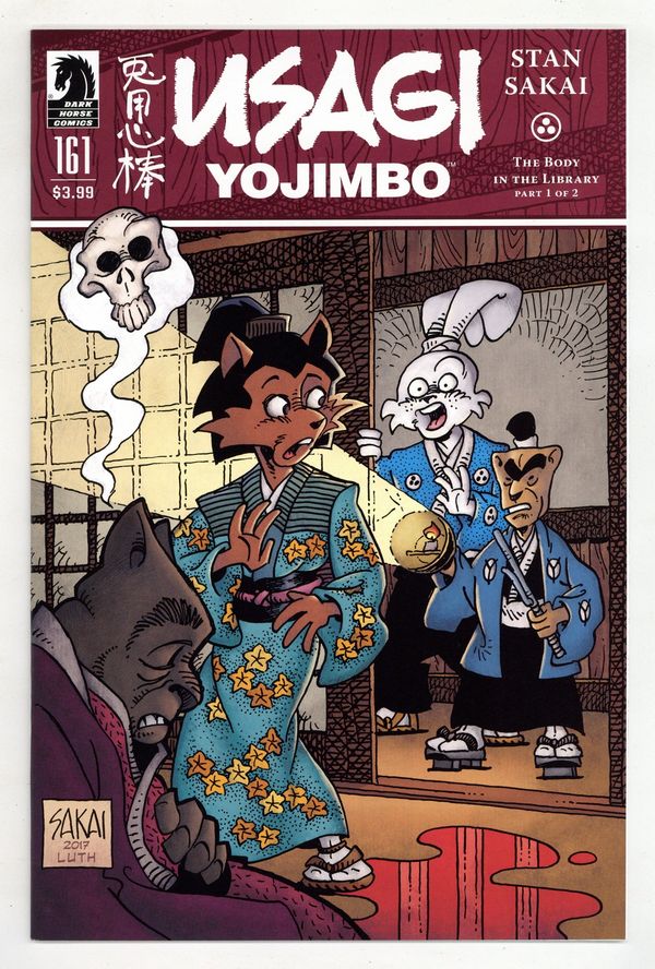 Published Sep 2017 by Dark Horse.$13.50Story, Art and Cover by Stan Sakai. The mischievous Kitsune and her young apprentice Kiyoko find themselves unexpectedly caught in the middle of a murder mystery. Luckily for them, Usagi and Inspector Ishida are leading the investigation. Can Usagi discover the culprit and clear the names of his sly friends, or has Kitsune finally exhausted her luck? Legendary comics creator Stan Sakai's original ongoing masterpiece! Part one of two-a great mystery begins for new fans! 24 pages, B&W. Cover price $3.99.