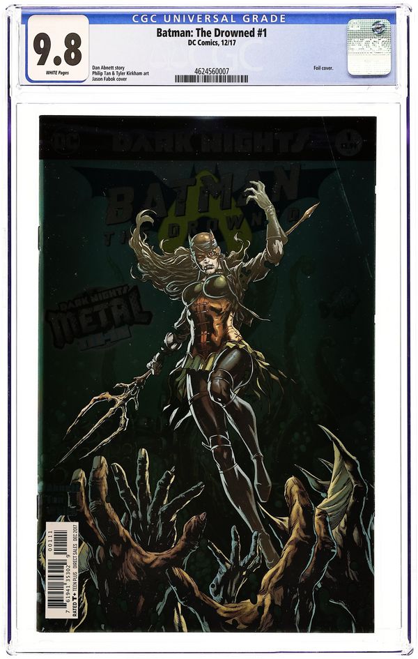 Written by Dan Abnett. Art by Philip Tan and Tyler Kirmham. Cover by Jason Fabok. As the events of DARK NIGHTS: METAL rock the DC Universe, the creatures of the Dark Multiverse stand ready to invade our world! How can even the World's Greatest Heroes stop a horde of deadly beings that appear to be powerful, nightmare versions of familiar figures? Find out in these special tie-in issues! 32 pages, full color. Rated T+ Cover price $3.99.