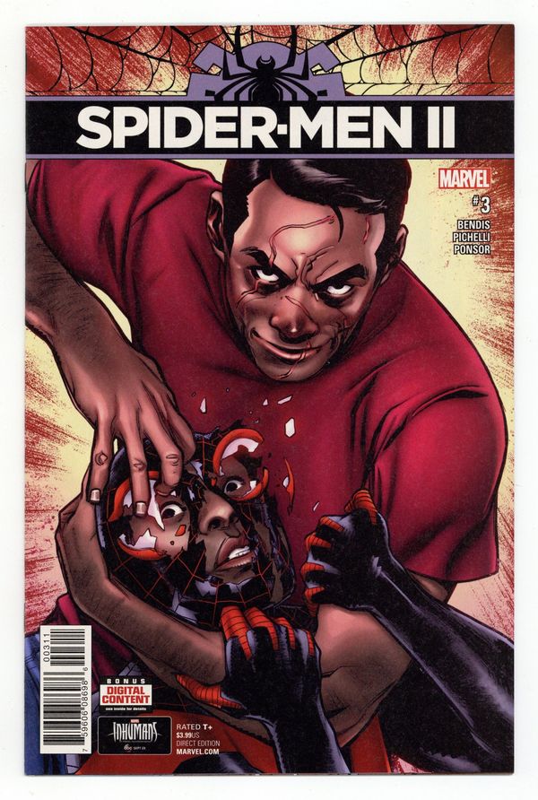 Tags: Spider-Man$12.00Written by Brian Michael Bendis. Art and Cover by Sara Pichelli. Meeting the Miles Morales who was already in the Marvel Universe sets OUR Miles OFF! As if he weren't struggling with interior conflicts that were tougher than the external conflicts, this revelation hits Miles hard. Luckily, Peter Parker, an expert on personal tragedy and dark spots, is by his side! 28 pages, full color. Rated T+ Cover price $3.99.