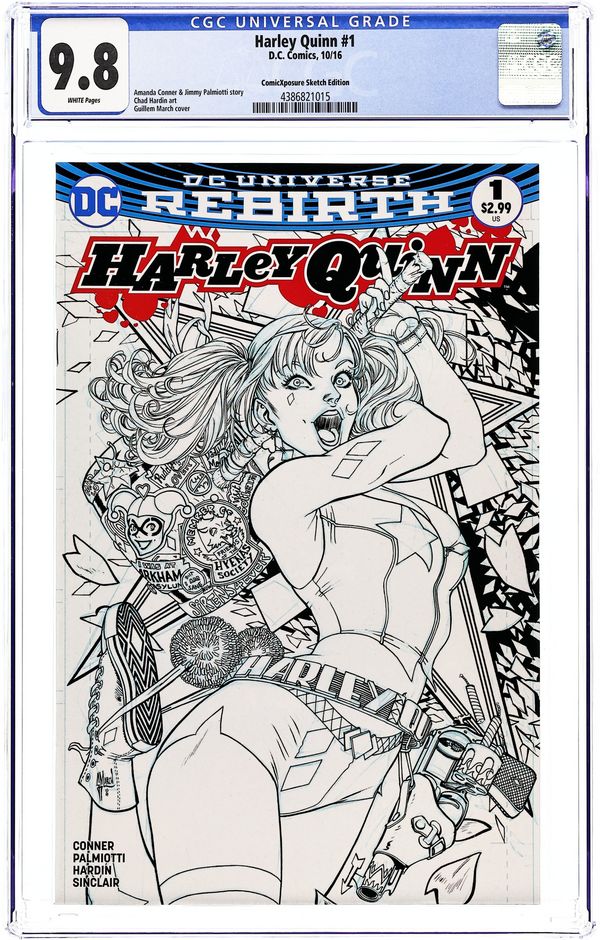 ComicXposure Sketch Variant cover by Guillem March. DC Universe Rebirth - Die Laughing: Part 1 of 3 - Written by Amanda Conner and Jimmy Palmiotti. Art by Chad Hardin. 'Die Laughing' part one! Welcome back to Harley Quinn's crazy world on Coney Island…now get ready to wave goodbye, because everyone there just might get eaten alive! Harley's gotta protect her neighborhood against an all-out zombie apocalypse! Break out the chainsaws, everybody! 32 pages, full color. Rated T+