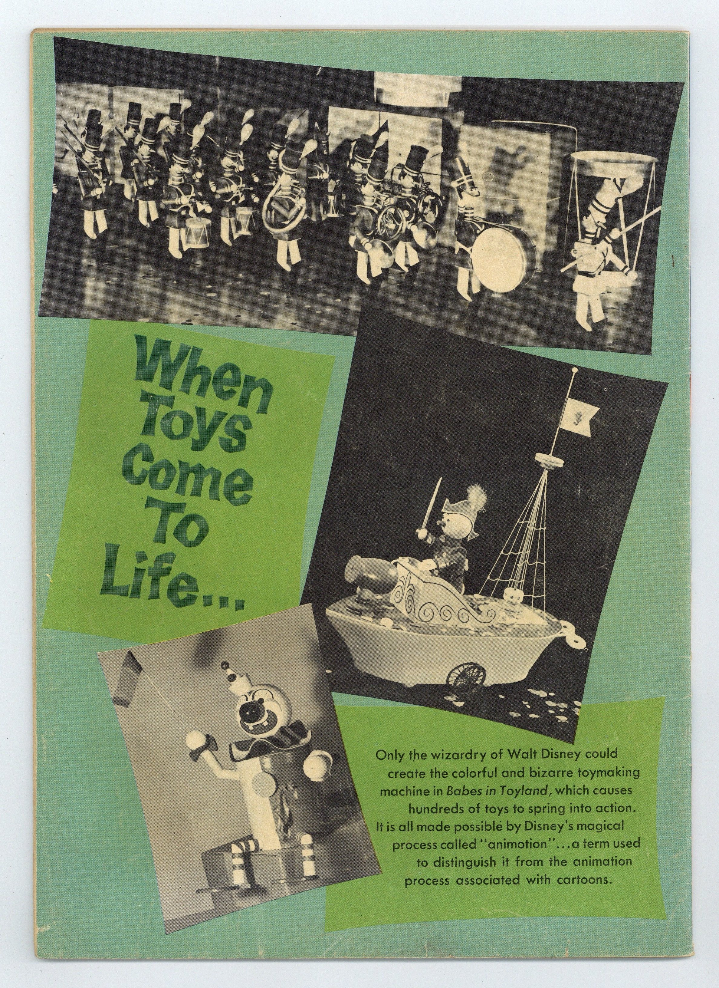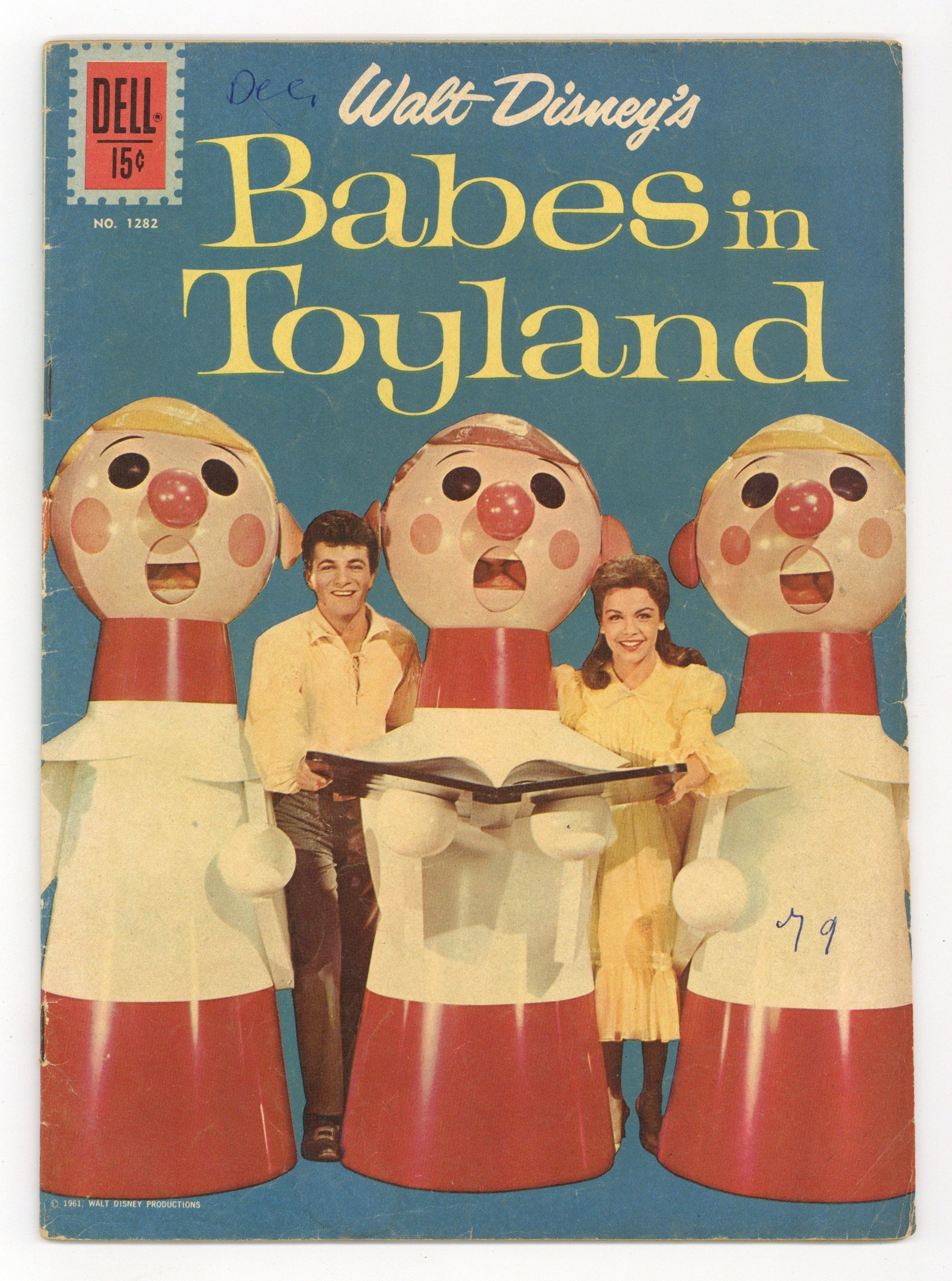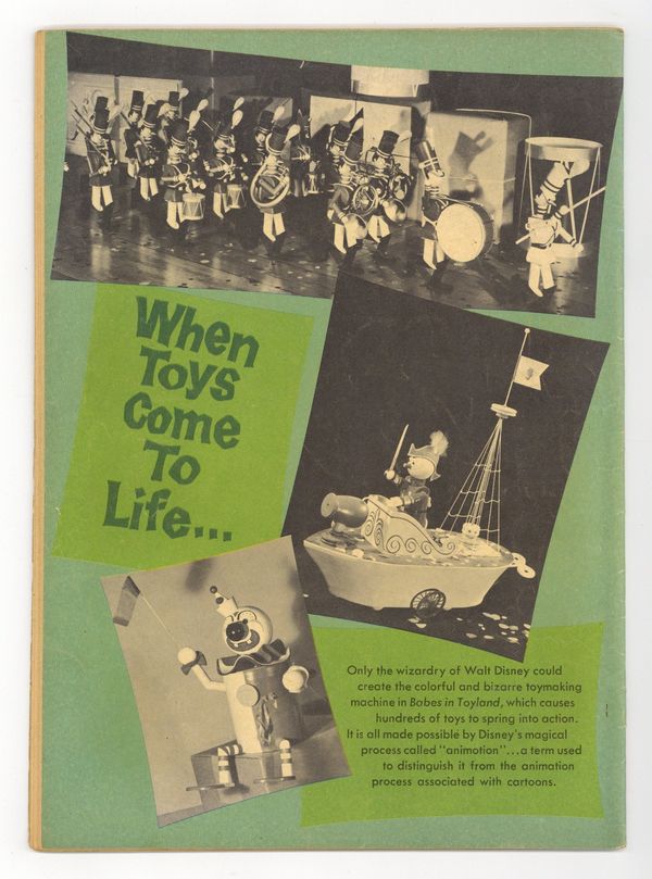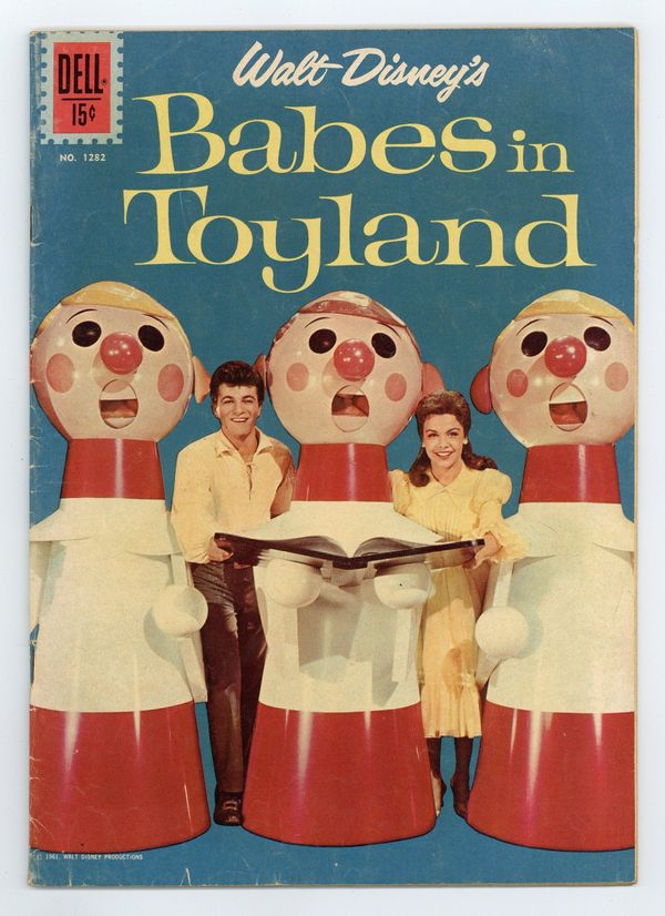 Variant with "When Toys Come to Life" article on back cover. Indicia title is "Walt Disney's BABES IN TOYLAND, No. 1282." Code number is BABES IN T. O.S. #1282-621. Copyright 1961 by Walt Disney Productions. Adapted from the 1961 Walt Disney movie "Babes in Toyland." Photo cover of Tom Piper (as played by Tommy Sands) and Mary Contrary (Annette Funicello). Preview with photos. Walt Disney's Babes in Toyland, screenplay by Ward Kimball, Joe Rinaldi, and Lowell S. Hawley, comic adaptation by Carl Fallberg, art by John Ushler; In Mother Goose Land, Tom Piper and Mary Contrary wish to wed, but miser Barnaby has Tom kidnapped and Mary's sheep stolen and taken to the Forest of No Return; By doing so he plans to force Mary to marry him; Tom returns and he and Mary go to the Forest of No Return, where they are taken by talking trees to Toyland. The Dancing Trees fact page; Description of how the tree costumes in the movie were made. 36 pages, full color. Cover price $0.15.