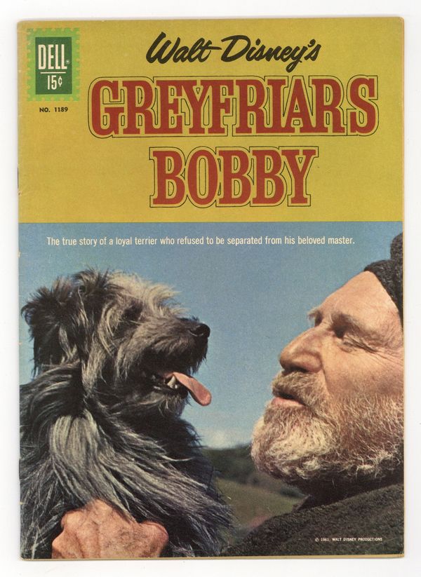 Art on back cover. Walt Disney's "Greyfriars Bobby" - Written by Eric Freiwald and Robert Schaefer. Art by Jesse Marsh. Photo Cover shows Donald Crisp and dog. The true story of a loyal terrier who refused to be separated from his beloved master! Also has the 1-pagers "Greyfriars Bobby and Other Terriers," "Bobby's Lasting Fame" and "Working Dogs"! 36 pages, full color. Cover price $0.15.