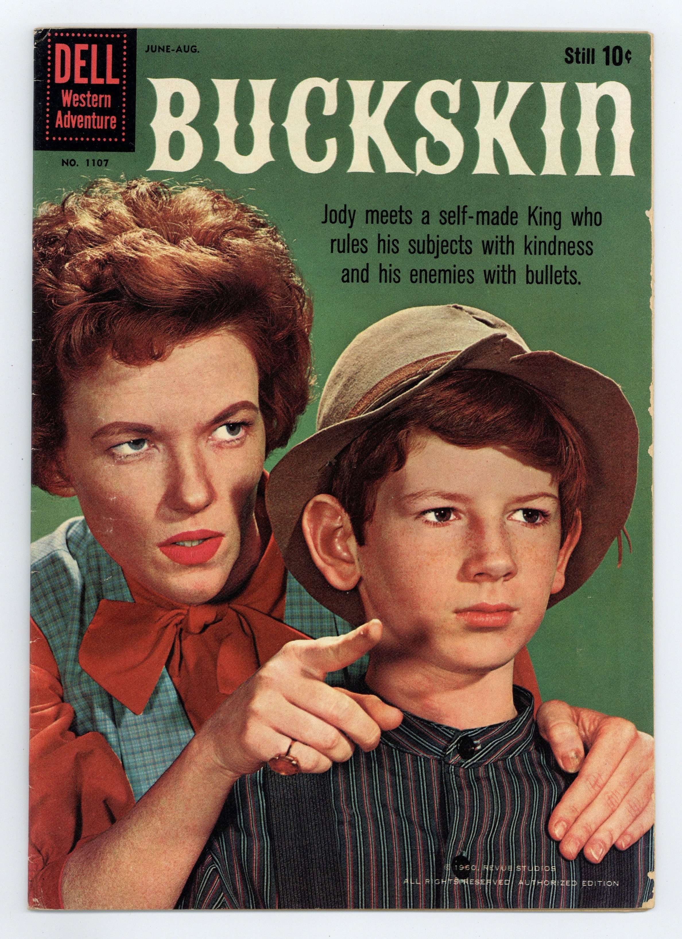 $19.00Art back cover. Indicia title is "BUCKSKIN, No. 1107." Based on the "Buckskin" TV series. Photo cover of Jody O'Connell (as played by Tom Nolan), and Annie O'Connell (as played by Sally Brophy). King of Montana; A stranger comes to the town of Buckskin and proclaims himself "The King of Montana." Danger Holiday; On his way by stagecoach to visit his aunt, Jody's stage is hijacked by an outlaw. Jody tricks the outlaw into driving into an canyon where he is overcome by heat. Stage to Buckskin; When a stage is robbed, an old man refuses to give the bandits his new boots. Scripts by Eric Feiwald and Robert Schaefer, art by Sparky Moore. 36 pages, full color. Cover price $0.10.