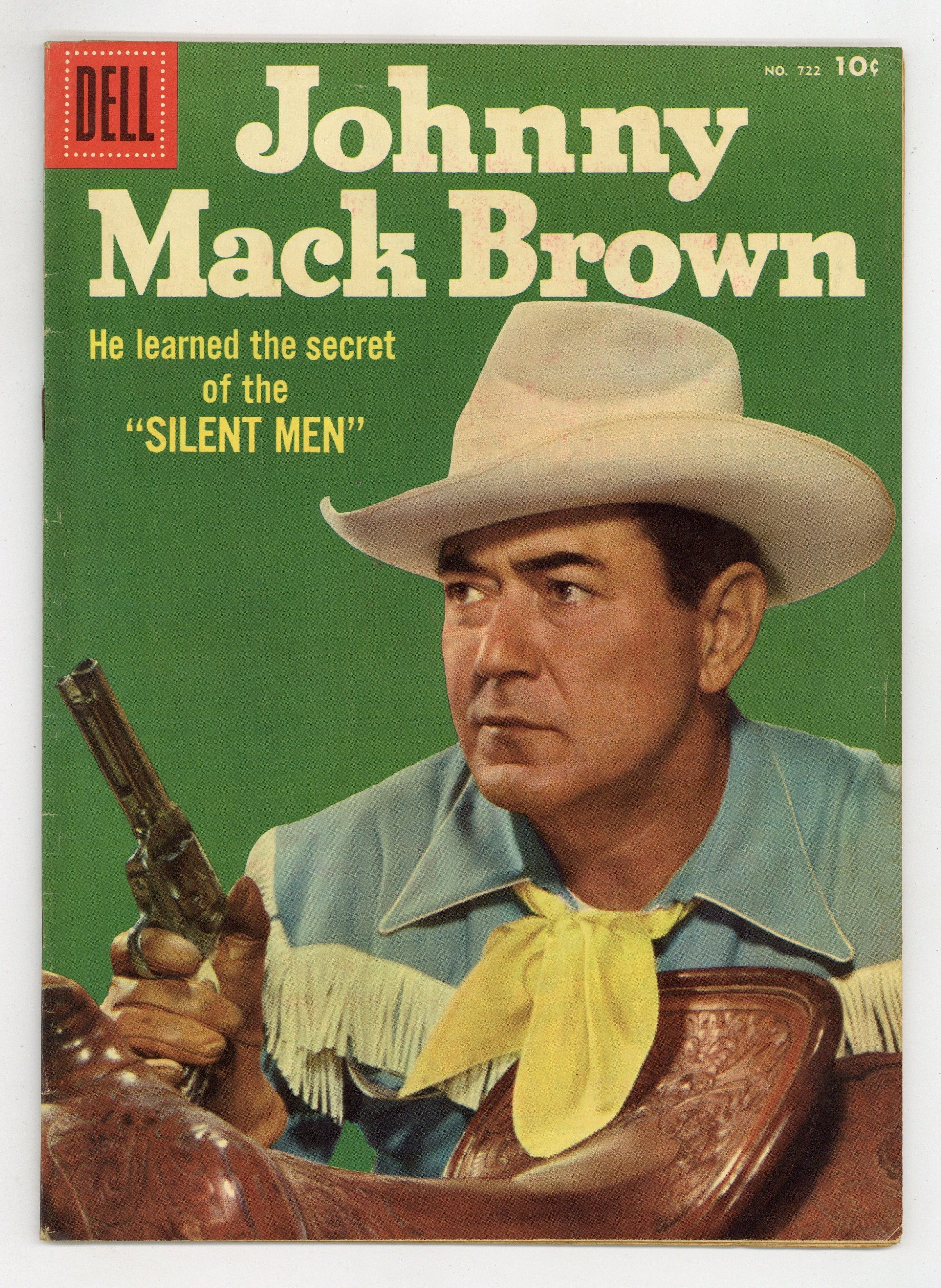 $19.00Photo back cover. Indicia title is "JOHNNY MACK BROWN, No. 722." Cover photo of Johnny Mack Brown. Facts about the Rough Riders regiment in the Spanish-American War. The Silent Men, pencils by Nicholas Firfires; While on his way to visit the Sheriff in Big Horn, Johnny stops at the tiny town of Deer Ford, only to get a cold reception from the townsfolk. The Good Samaritan, art by Nat Edson; After the school in Shallow Creek burns, miser Abney Streetch volunteers to provide the funds from his bank account in Great Falls; Johnny goes along as a guard, but on the way back the stage is robbed. Facts about the training of horses to be cow ponies. 36 pages, full color. Cover price $0.10.