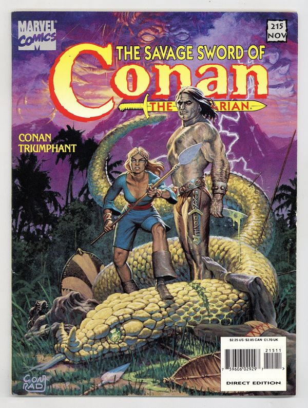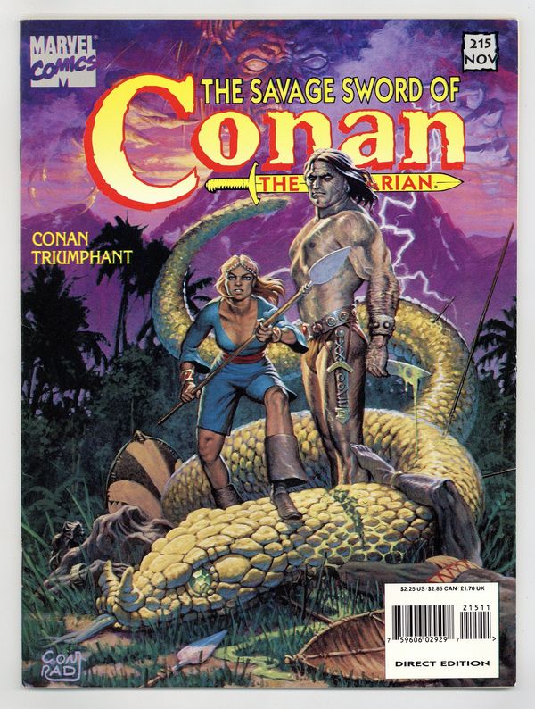 $7.80Conan stars in "When Wakes the Serpent." Script by Roy Thomas, art by Rafael Kayanan. Part 4 of the adapation of "Conan and the Gods of the Mountain" by Roland Green, the sequel to "Red Nails." King Kull stars in "The Savage Brotherhood." Script by John Arcudi, pencils by Donald Hudson, inks by E.R. Cruz. Kull also stars in "Caresses of Mine Enemy." Script by Thomas (from a plot by Arcudi), pencils by Dale Eaglesham (no inker on this story). Colin MacNeil, Rey Garcia, and Reggie Jones portfolios. Article, "The Universal Appeal of Conan" by Bill Barker. Tim Conrad cover. Cover price $2.25.