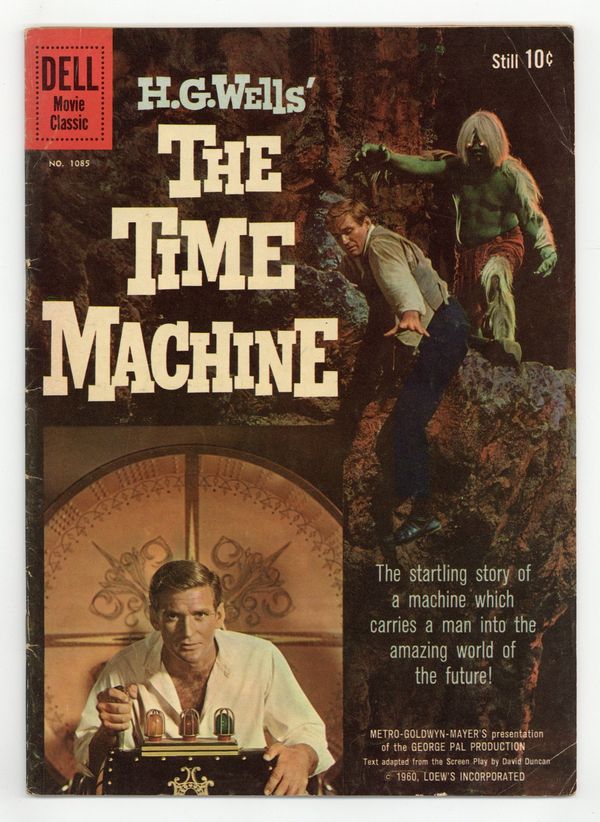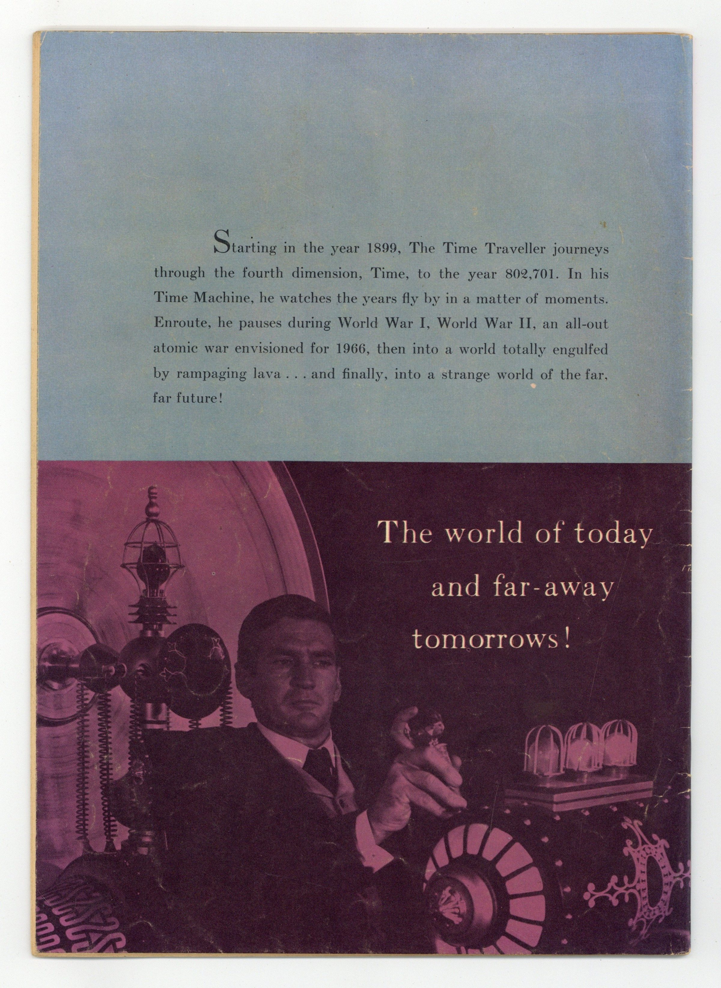 $38.50Movie photo on back cover. H.G. Wells' "The Time Machine" - Written by unknown (adaptation). Art by Alex Toth. Photo Cover. Metro-Goldwyn-Mayer's presentation of the George Pal Production. Text adapted from the screenplay by David Duncan. The startling story of a machine which carries a man into the amazing world of the future! 36 pages, full color. Cover price $0.10.
