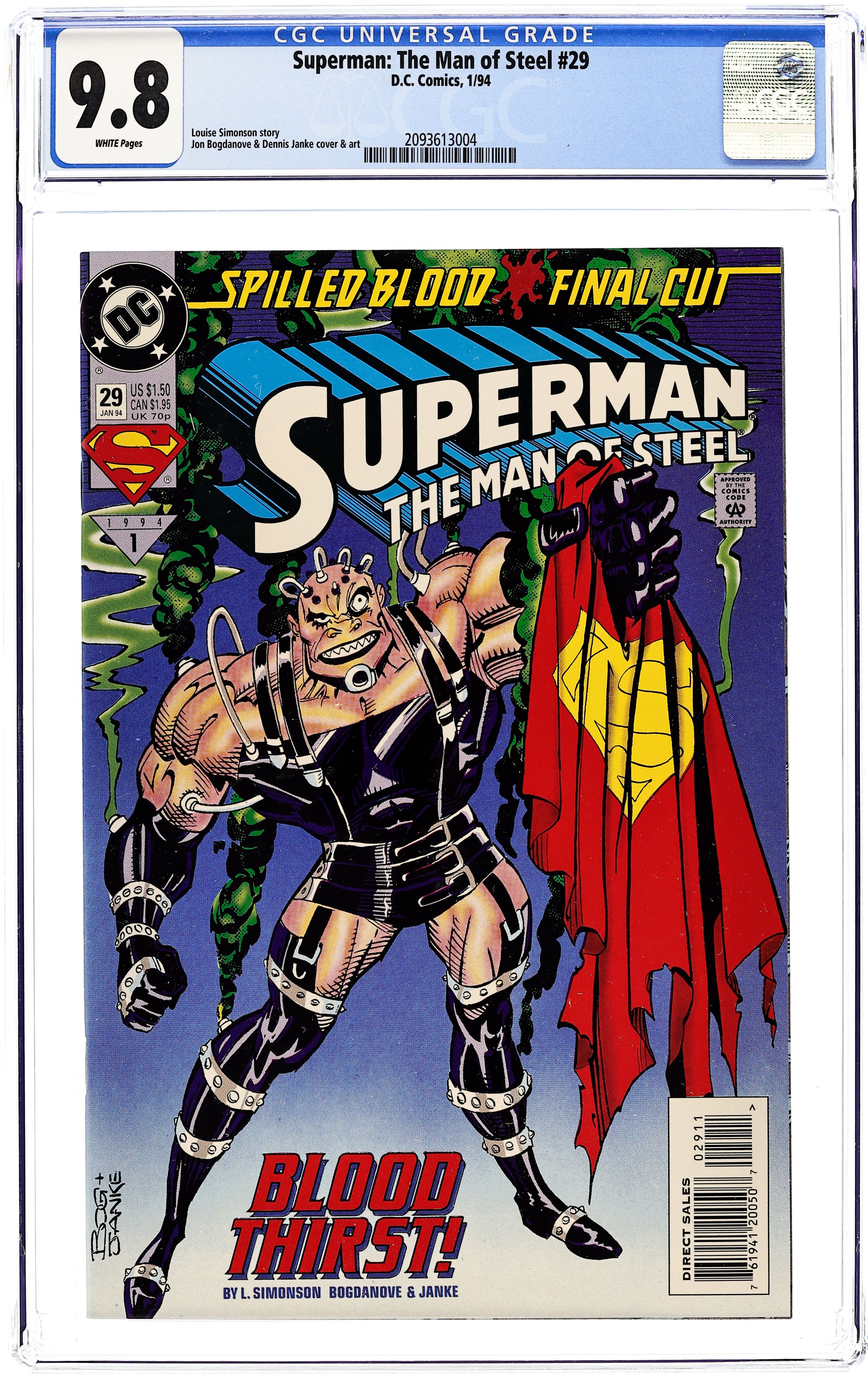 Part 3 of the 3-part 'Spilled Blood,' continued from Action Comics (1938 DC) #694. The mastermind behind Bloodsport and Hi-Tech's recent Metropolis massacres takes center stage as the man called Bloodthirst declares war on Superman. Written by Louise Simonson, with art and cover by Jon Bogdanove and Dennis Janke. Cover price $1.50.