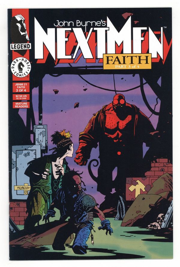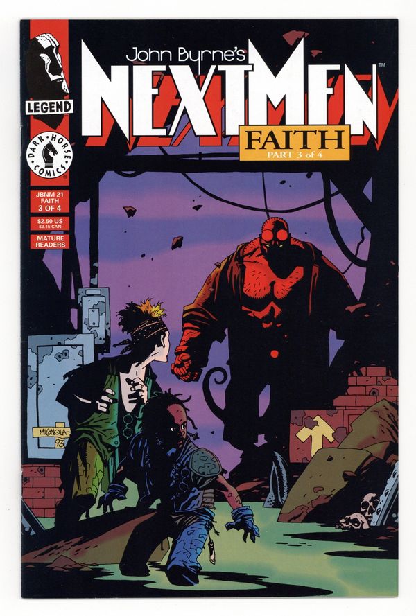 Published Dec 1993 by Dark Horse.$179.00NOTE: 1st appearance of Mike Mignola's Hellboy (1st full app. in comic books) - Faith: Part 3 of 4 - Story and art by John Byrne. Cover by Mike Mignola. Guest-starring Hellboy. When Legends clash! (Or crossover!) Presenting the first "official crossover" within the Legend line -- the Next Men meet Mike Mignola's HELLBOY! Danny is actually the lucky one to have his path cross that of the World's Greatest Paranormal Investigator, in a segment drawn by guest Legend star Mike Mignola. Meanwhile, we present the life of Christ as seen through the eyes of Jack, whose imagination infuses the well-known story with some familiar faces. In the ongoing saga of Mark, a.k.a. MIV, we find out just what he's been doing during the missing seven years of his life. 36 pages, full color. Cover price $2.50.