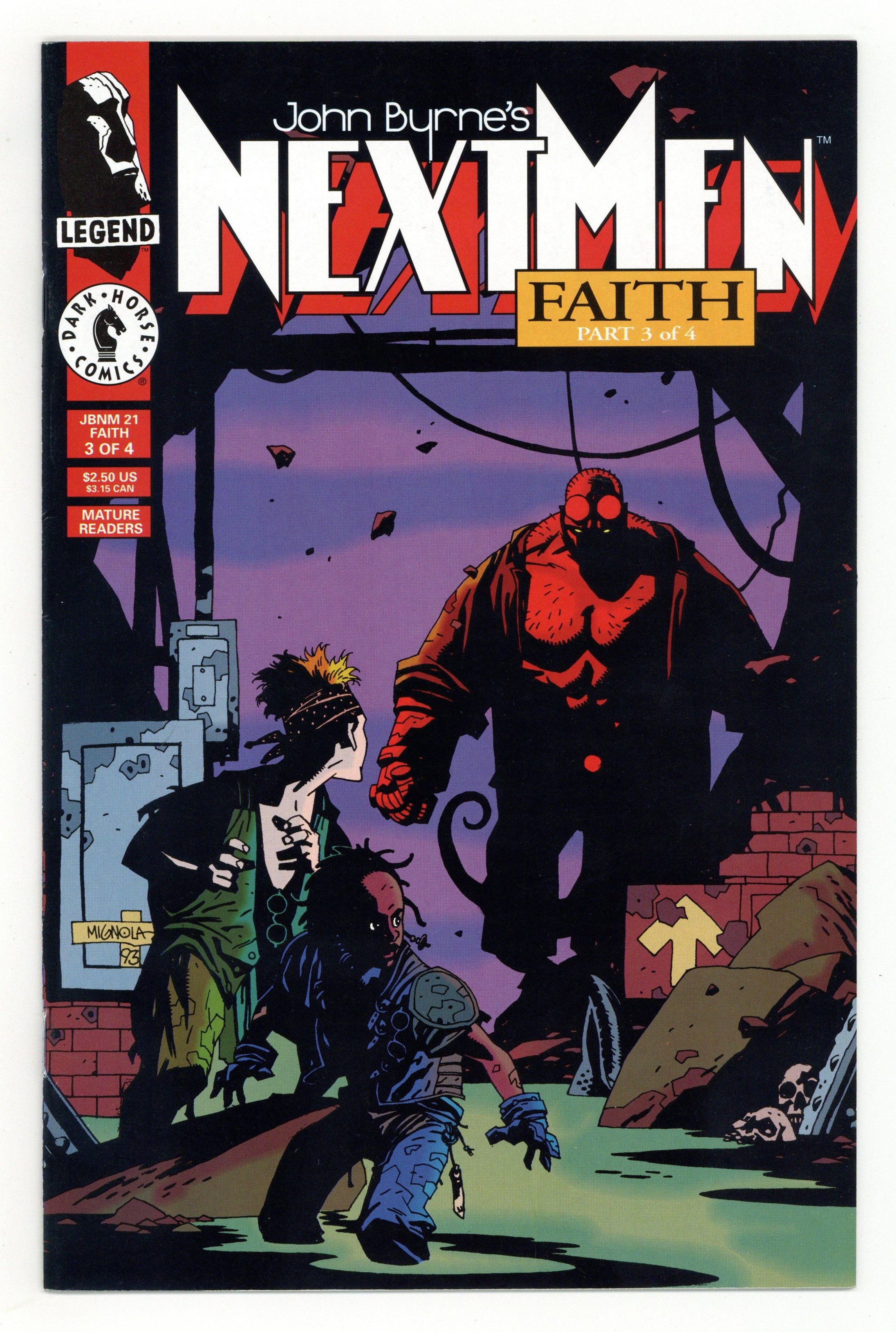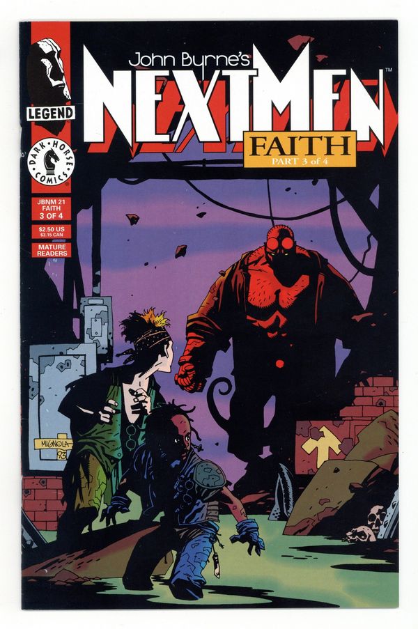 Published Dec 1993 by Dark Horse.$115.00NOTE: 1st appearance of Mike Mignola's Hellboy (1st full app. in comic books) - Faith: Part 3 of 4 - Story and art by John Byrne. Cover by Mike Mignola. Guest-starring Hellboy. When Legends clash! (Or crossover!) Presenting the first "official crossover" within the Legend line -- the Next Men meet Mike Mignola's HELLBOY! Danny is actually the lucky one to have his path cross that of the World's Greatest Paranormal Investigator, in a segment drawn by guest Legend star Mike Mignola. Meanwhile, we present the life of Christ as seen through the eyes of Jack, whose imagination infuses the well-known story with some familiar faces. In the ongoing saga of Mark, a.k.a. MIV, we find out just what he's been doing during the missing seven years of his life. 36 pages, full color. Cover price $2.50.