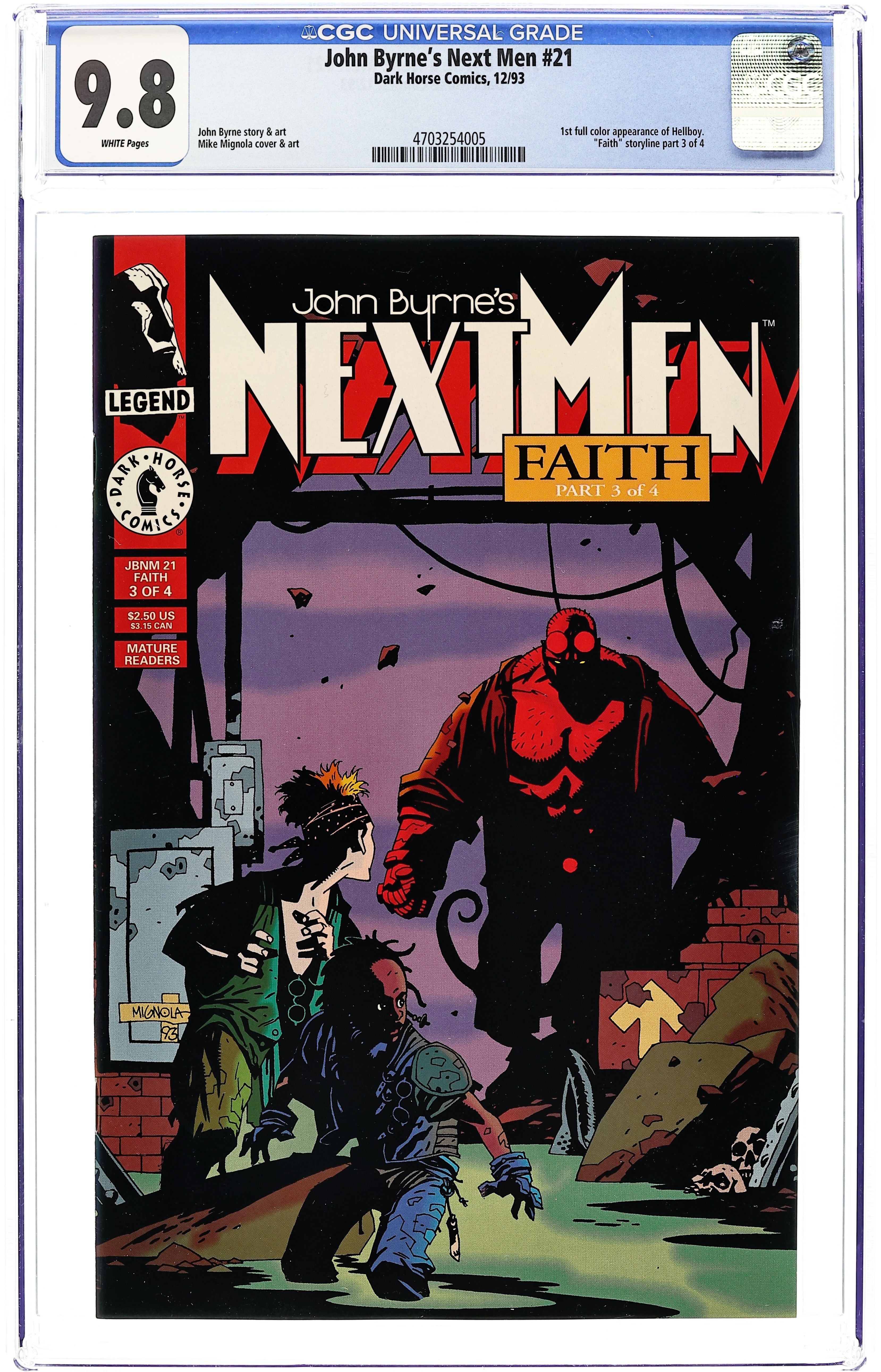 Published Dec 1993 by Dark Horse.$145.00NOTE: 1st appearance of Mike Mignola's Hellboy (1st full app. in comic books) - Faith: Part 3 of 4 - Story and art by John Byrne. Cover by Mike Mignola. Guest-starring Hellboy. When Legends clash! (Or crossover!) Presenting the first "official crossover" within the Legend line -- the Next Men meet Mike Mignola's HELLBOY! Danny is actually the lucky one to have his path cross that of the World's Greatest Paranormal Investigator, in a segment drawn by guest Legend star Mike Mignola. Meanwhile, we present the life of Christ as seen through the eyes of Jack, whose imagination infuses the well-known story with some familiar faces. In the ongoing saga of Mark, a.k.a. MIV, we find out just what he's been doing during the missing seven years of his life. 36 pages, full color. Cover price $2.50.
