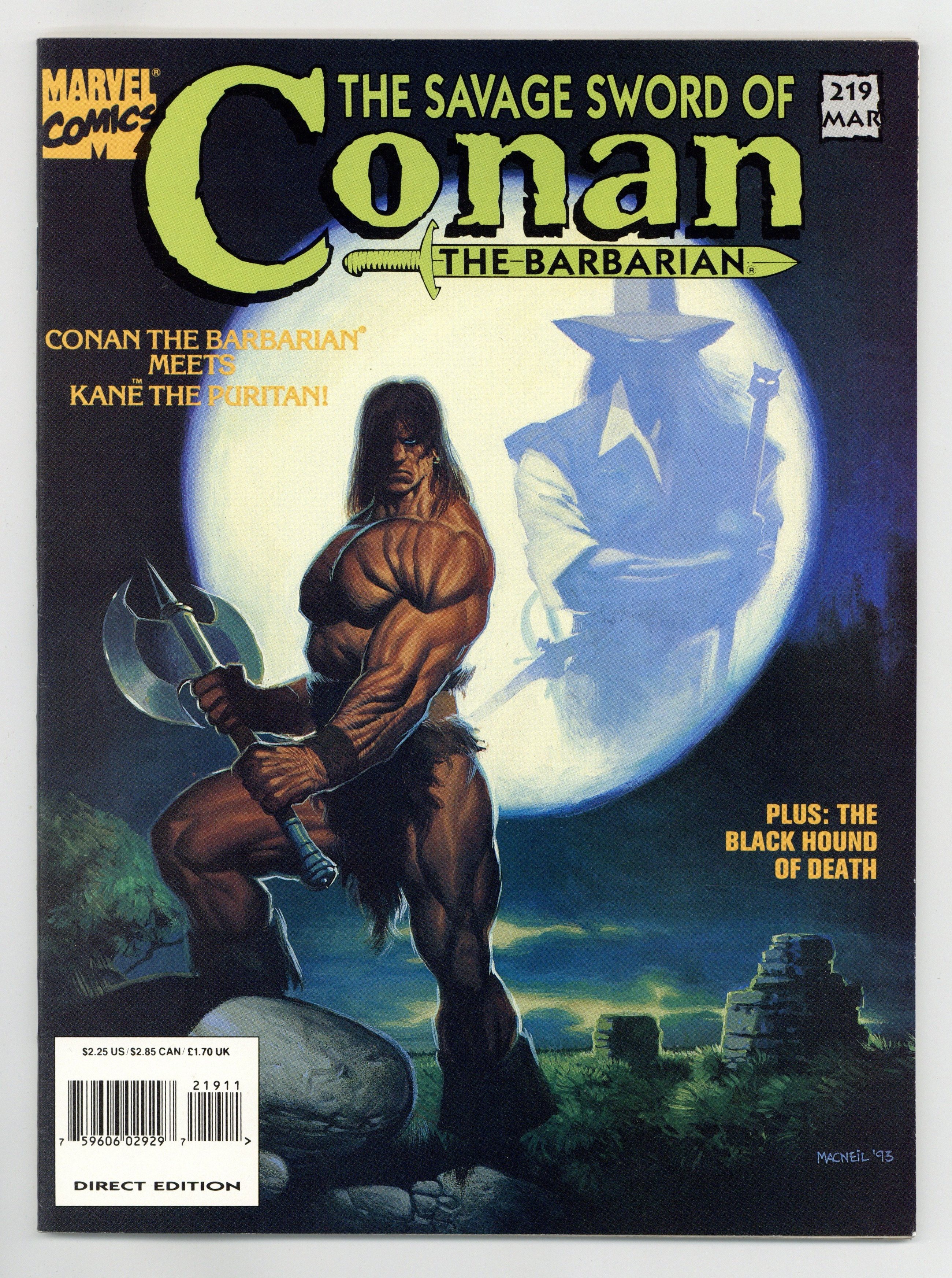 $16.75Conan/Solomon Kane crossover, "Death's Dark Riders." Script by Roy Thomas, art by Colin MacNeil. Young Conan stars in "Black Hound of Death." Script by Thomas, pencils by Mike Docherty, inks by E.R. Cruz. Adapated from a non-Conan story by Robert E. Howard. Article, "Kane, the Avenger: The Life and Times of Solomon Kane" by Fred Blosser. Illustrations by Bob Gould/Duffy Vohland, John Buscema, Howard Chaykin, and others (uncredited). MacNeil cover. Cover price $2.25.