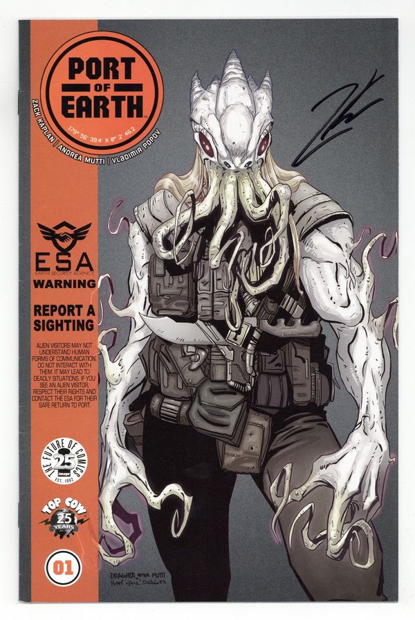 Written by Zack Kaplan. Art by Andrea Mutti. Cover by Nick Dragotta. Imagine if aliens came to Earth not in war or peace, but with a business deal: open up a spaceport here on Earth in exchange for advanced technology. But when our alien visitors break Port restrictions and wreak havoc in our cities, it falls to the newly formed Earth Security Agents to hunt down and safely deport the dangerous rogue aliens back to the Port of Earth. A gritty sci-fi action thriller from new comic book writer ZACK KAPLAN (ECLIPSE) and ANDREA MUTTI (Rebels, Star Wars, Batman Eternal, Prometheus). 28 pages, full color, Rated T + Cover price $3.99.