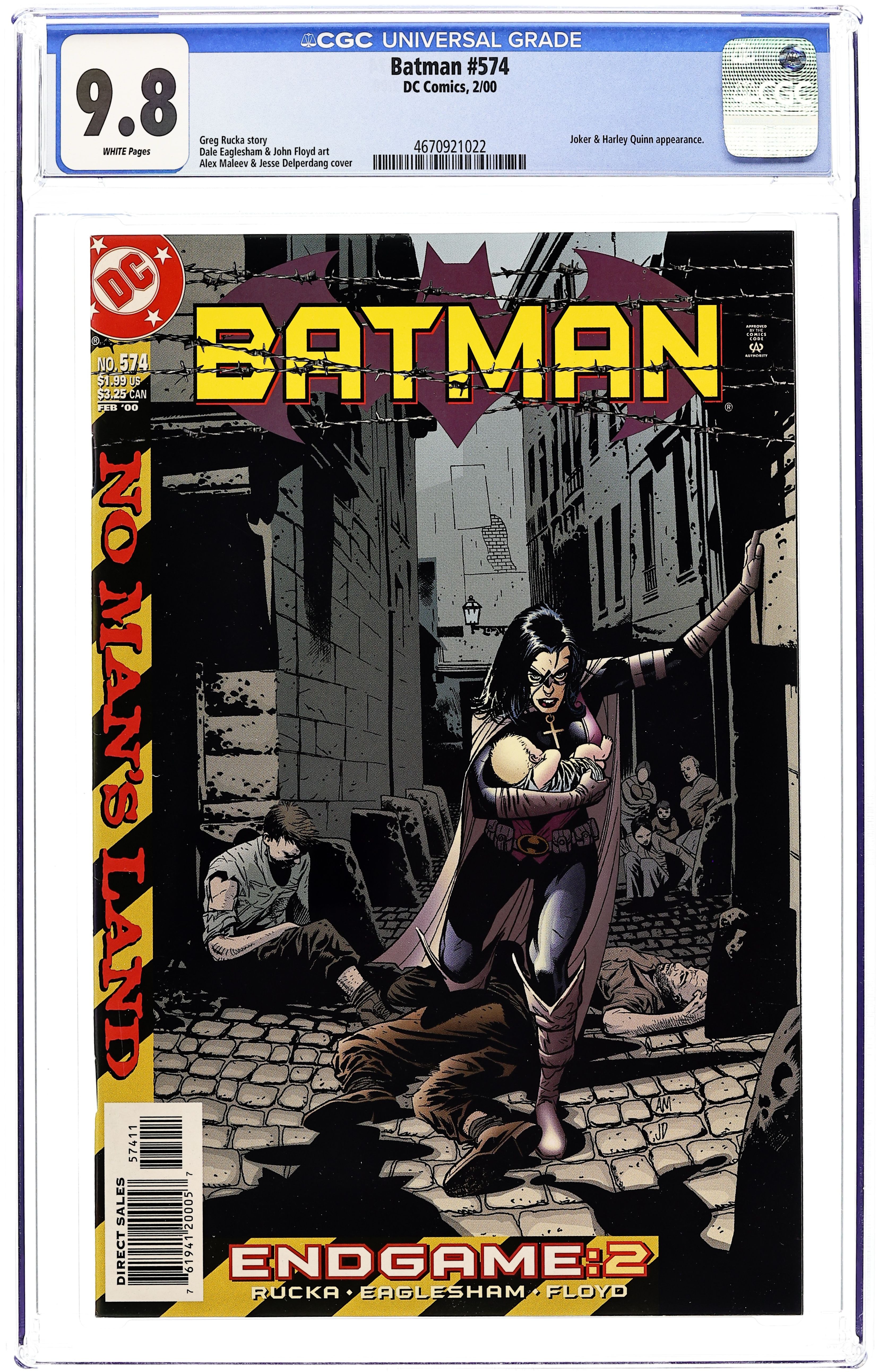WRITTEN BY GREG RUCKA AND DEVIN GRAYSON; ART BY DALE EAGLESHAM AND JOHN FLOYD; COVER BY ALEX MALEEV AND JESSE DELPERDANG. Part 2 of the 3-part "Endgame" for "No Man's Land." Christmas Eve in No Man's Land finds the Joker and Harley running wild with no Batman in sight! As their master plan to destroy Gotham City's future is revealed, only the Huntress stands a chance of stopping the Clown Couple of Crime. Unfortunately, she'll have to fight her way through all of the Joker's forces to get to them. 40 Pages, Full Color. Batman No Man's Land Cover price $1.99.