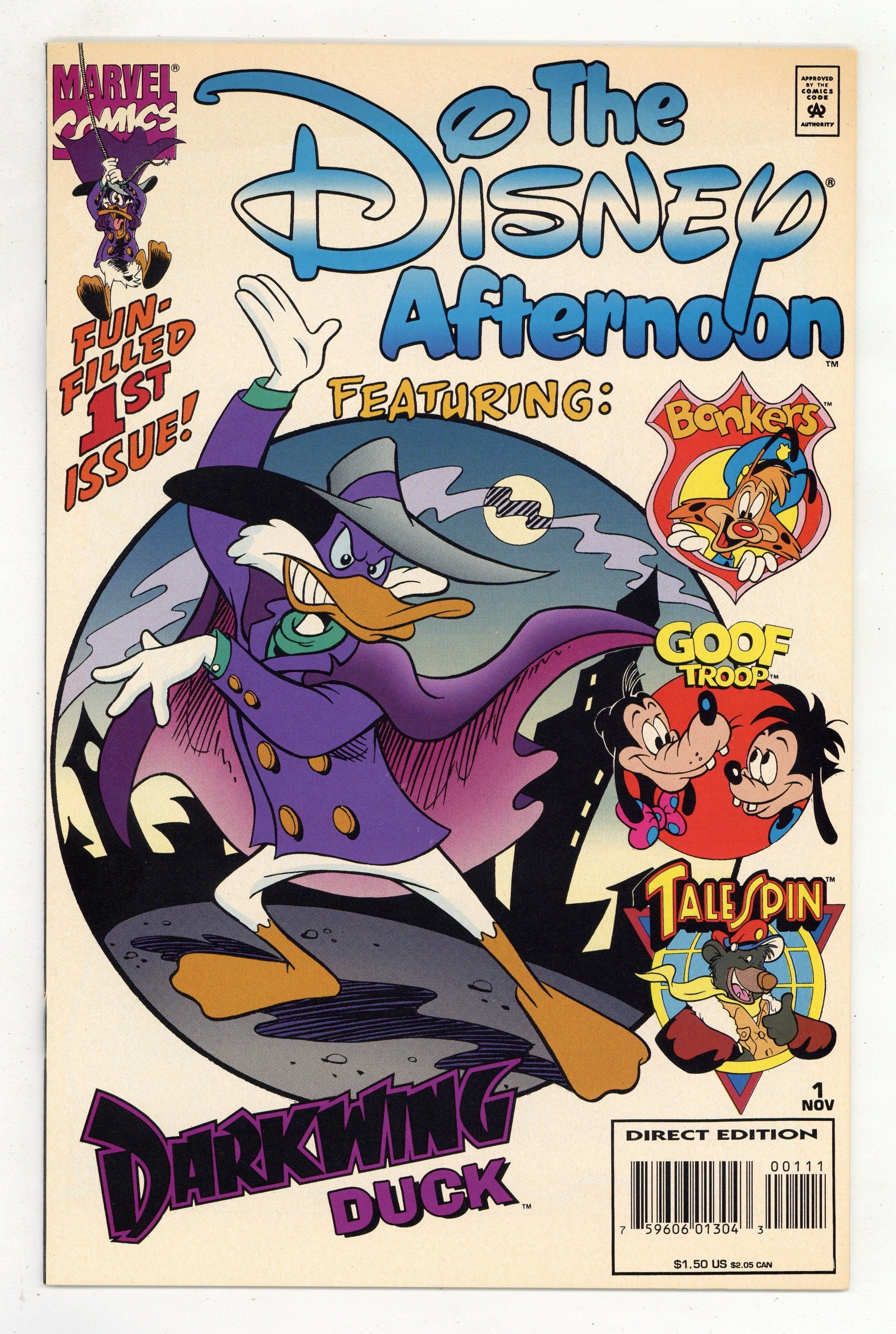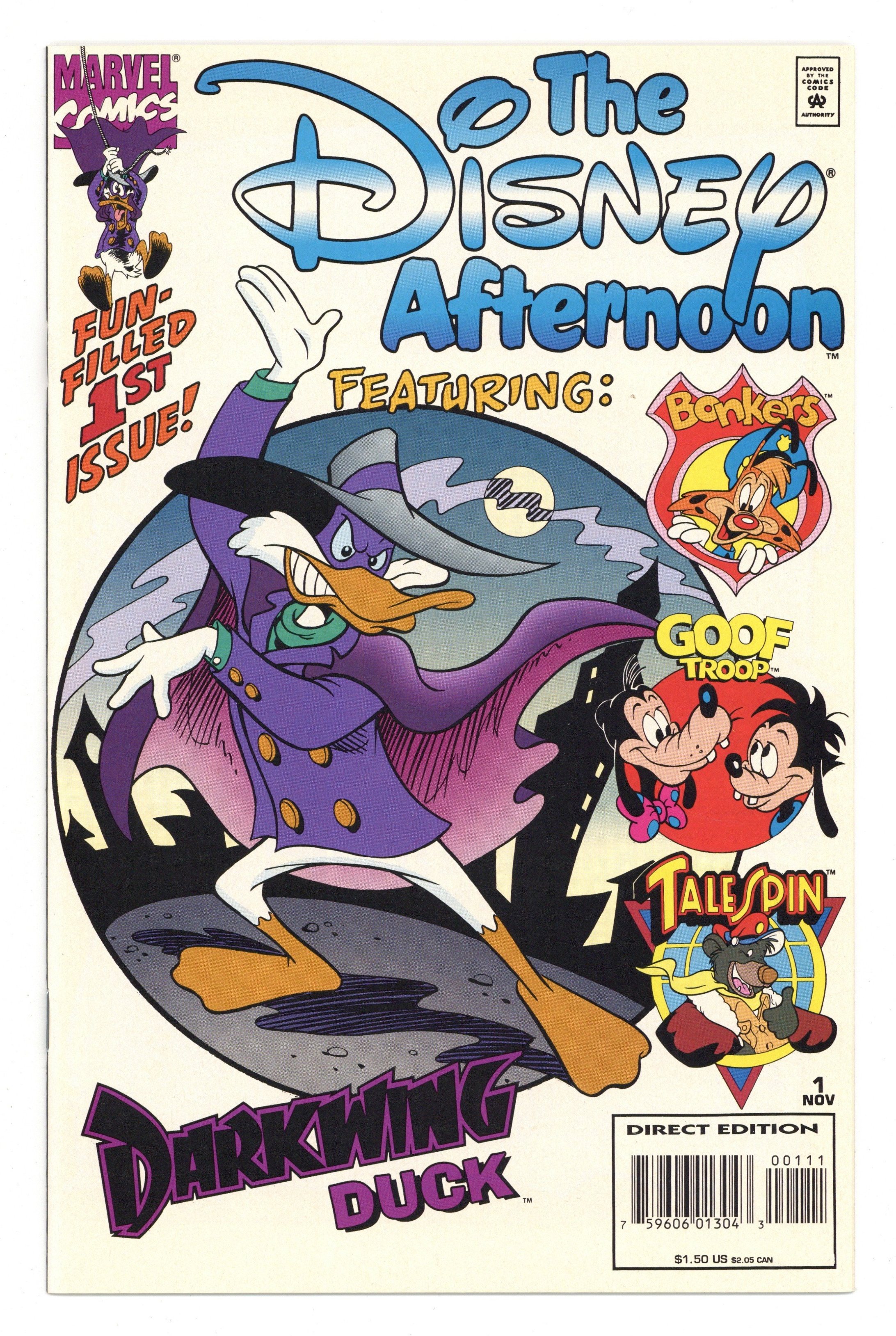 It's Darkwing Duck to the rescue as he takes on the Fearsome Five in an action-packed adventure! Disney Afternoon presents fresh, new characters in brand new, exciting escapades. Join TaleSpin, Goof Troop, Bonkers and more for hilarious fun! Written by John Blair Moore, Roger Brown and Janet Gilbert. Pencils by John Blair Moore, Cosme Quartieri, Andres Klacik and Rick Stasi. Cover by John Blair Moore and Andres Klacik. Cover price $1.50.