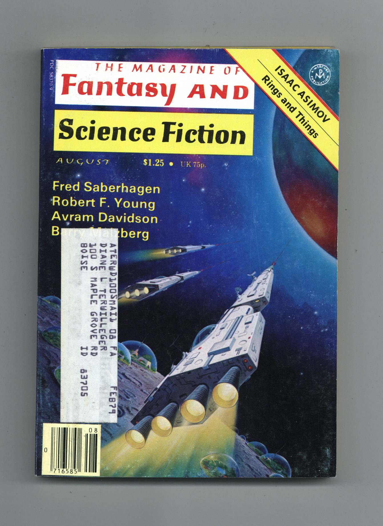 Tags: Anthology / CollectionPublished Aug 1978 by Mercury Publications.$7.00Volume 55, Issue 2 - August 1978. Cover by Alex Schomburg. Fantasy and science fiction stories by Fred Saberhagen, Avram Davidson, Rod Keen, Herbie Brennan, Barry N. Malzberg, Larry Eisenberg and Robert F. Young. 5 1/2-in. x 7 1/2-in., 162 pages, B&W Cover price $1.25.