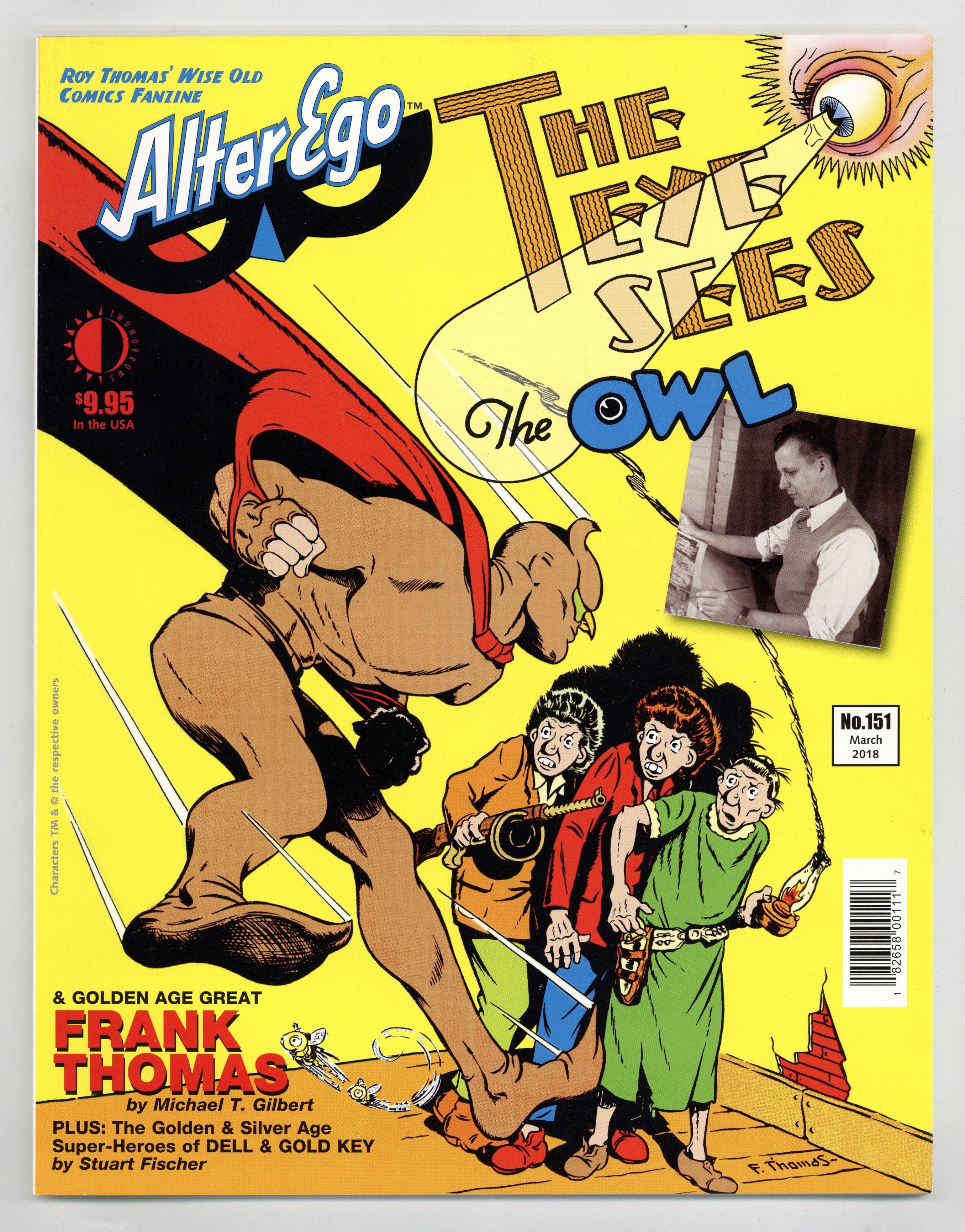 Published Mar 2018 by TwoMorrows.$13.50It's The Owl! The Eye! Dr. Hypno! Solarman! Fantom of the Fair! These are just some of the fabulous Golden Age heroes drawn by Frank Thomas, whose life and times are celebrated by Mr. Monster's Comic Crypt's Michael T. Gilbert! Also: from Captain Midnight to Korak - from Magic Morro to Magnus, Robot Fighter - the scintillating (and often offbeat) Golden & Silver Age super-heroes of Western Publishing's Dell & Gold Key comics, annotated by Stuart Fischer! Art by Manning, Ditko, Kane, Marsh, Gill, Spiegle, Springer, Norris, Santos, Thorne, et al.! Plus: My Life in Little Pieces, Part 3 - more of the "off-beat autobio" of Golden & Silver Age writing great John Broome; Ted White on Comics, Part 5 - concluding Bill Schelly's talk with the SF fan, writer and editor; Fawcett Collectors of America #210 - P.C. Hamerlinck presents Mike Tiefenbacher on the Captain Marvel copyright crisis. Cover by Frank Thomas. Edited by Roy Thomas. 96 pages. Cover price $9.95.