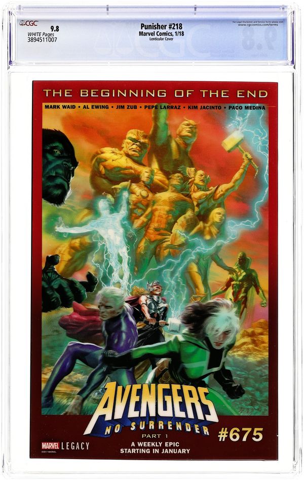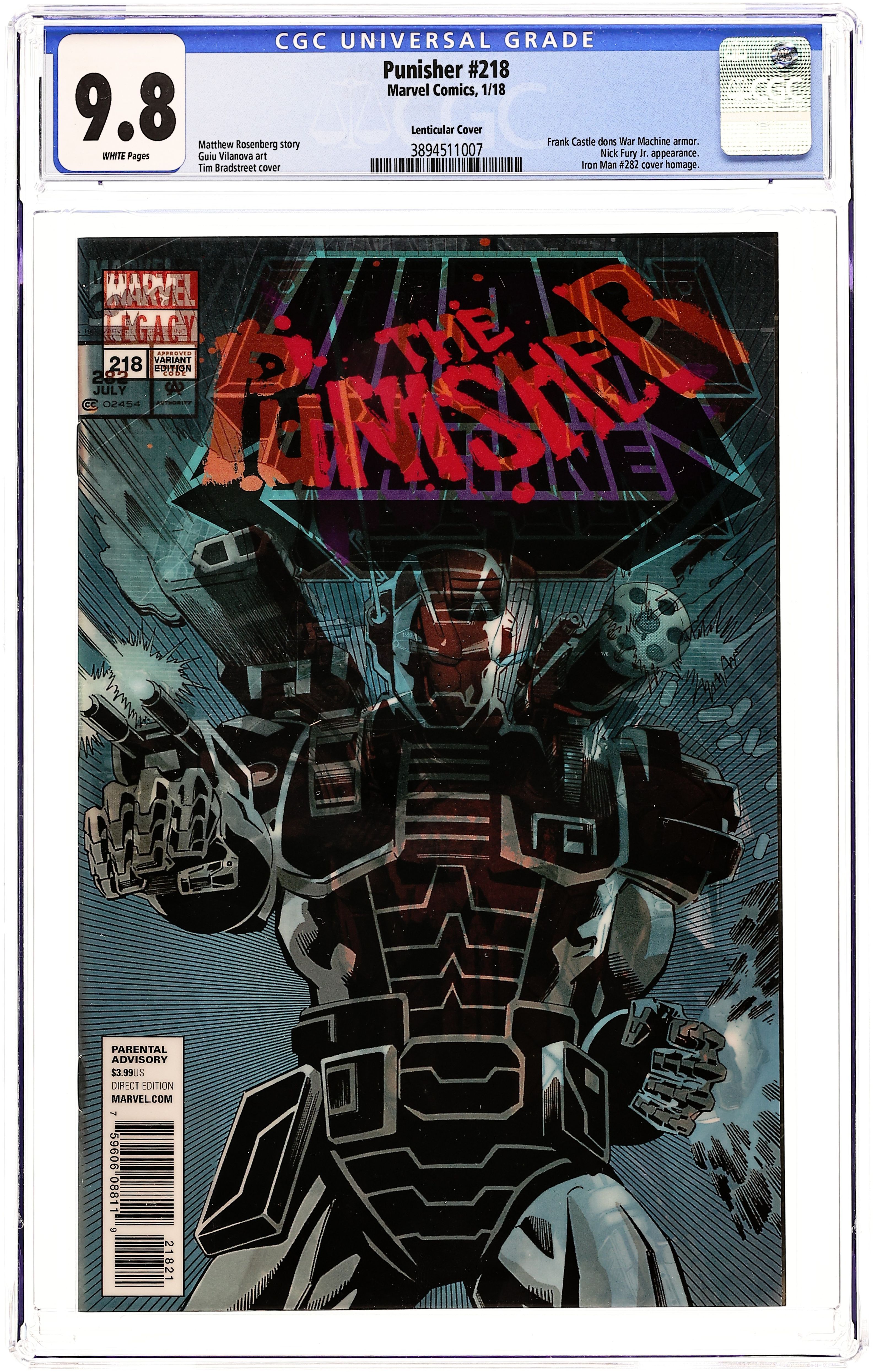Lenticular Variant Cover. Punisher: War Machine: Part 1 of 6 - Written by Matthew Rosenberg. Art by Guiu Vilanova. Cover by Tim Bradstreet. - For years, Frank Castle has been fighting a one-man war against criminals who endanger the innocent, but when a certain one-eyed operative offers him the tools to take his fight global…how could he say no? Find out how Frank found his way into the WAR MACHINE Armor! PLUS: Includes 3 bonus MARVEL PRIMER PAGES! Rated T+ 28 pages, full color, Parental Advisory Cover price $3.99.