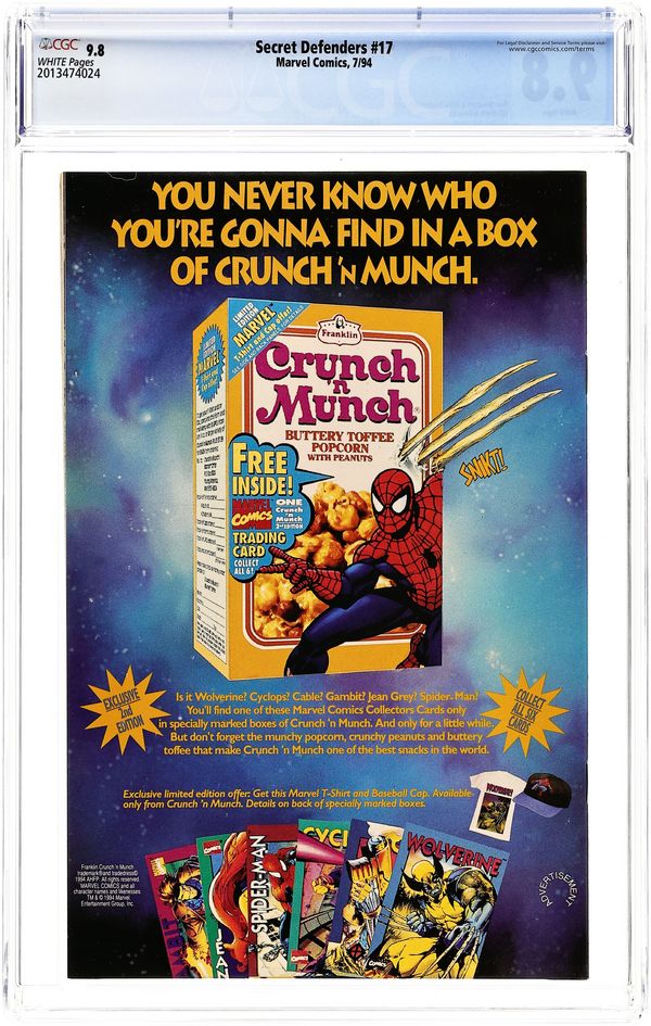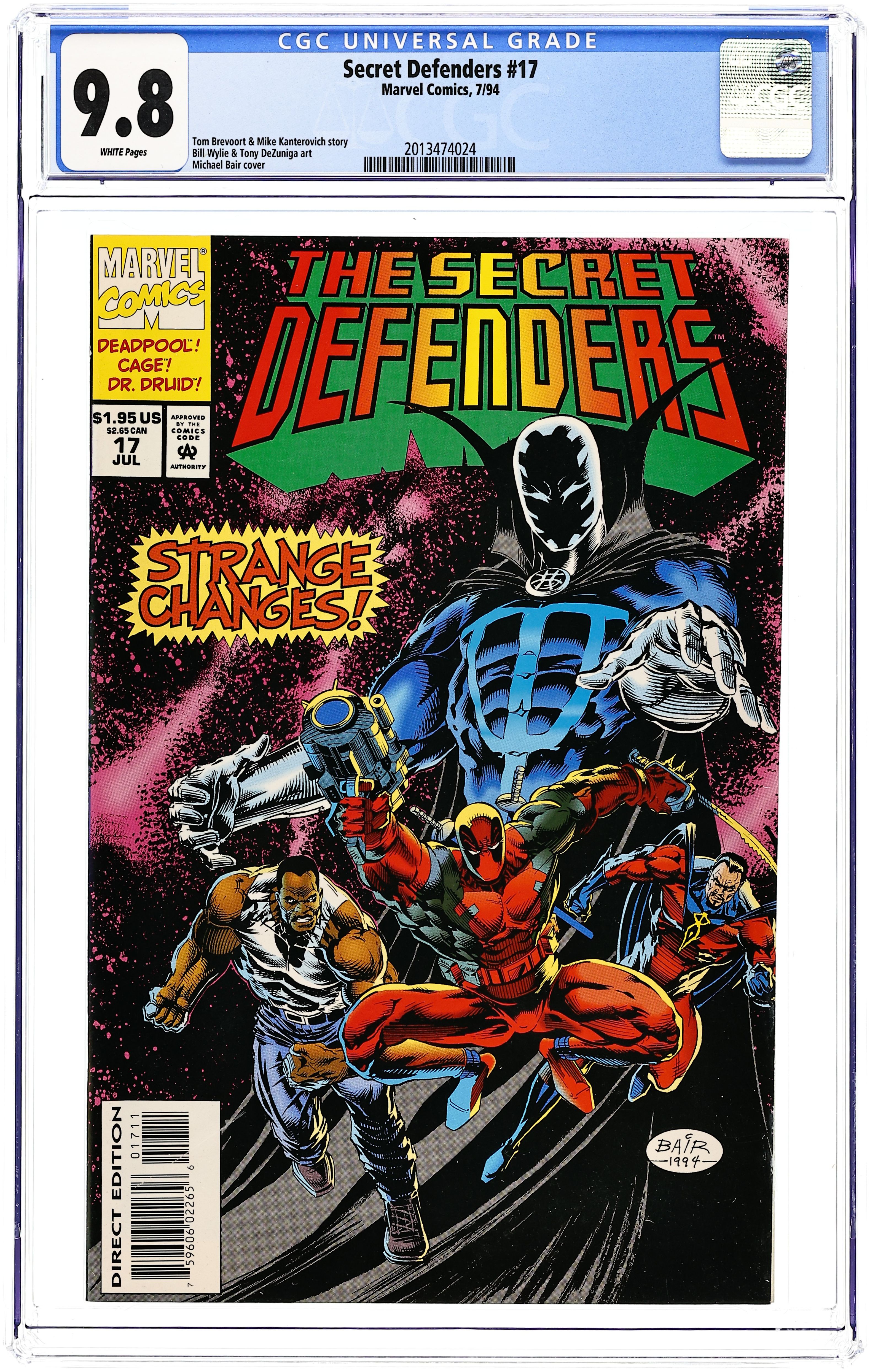 Cover art by Michael Bair. Strange Changes, Part 3: On Borrowed Time starring Dr. Druid, Luke Cage [Power Man], Deadpool, Shadowoman, Cadaver, Dr. Strange, and Malachi, script by Tom Brevoort and Mike Kanterovich, pencils by Jerry DeCaire, inks by Tony DeZuniga; while the Secret Defenders try to get the Moebius Stone from Malachi, Strange shows up to claim the power of Agamotto for himself; Dr. Druid destroys the stone and returns reality back to normal. 36 pgs. $1.95. Cover price $1.95.