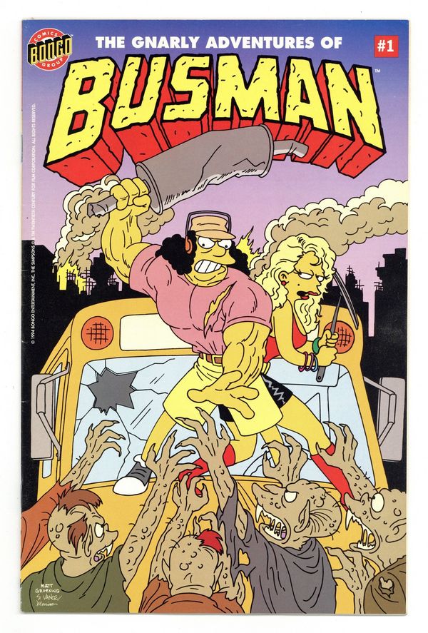 Flip book cover. Back cover is "The Gnarly Adventures of Busman." Infinity cover. Cover pencils by Steve Vance, inks by Bill Morrison. It's in the Cards, script by Steve Vance (co-plot, script); Cindy Vance (co-plot), pencils by Steve Vance (layouts), Bill Morrison (finishes), Tim Bavington (finishes), and Phil Ortiz (assist), inks by Bill Morrison and Tim Bavington; Bart gets revenge on a baseball player who gets him and Milhouse ejected from the game. Matt Groening discusses his dislike of President Richard Milhous Nixon. Busman starring Otto, script by Steve Vance, pencils by Steve Vance (layouts) and Bill Morrison (finishes), inks by Tim Bavington. 36 pgs. $2.25. Cover price $2.25.