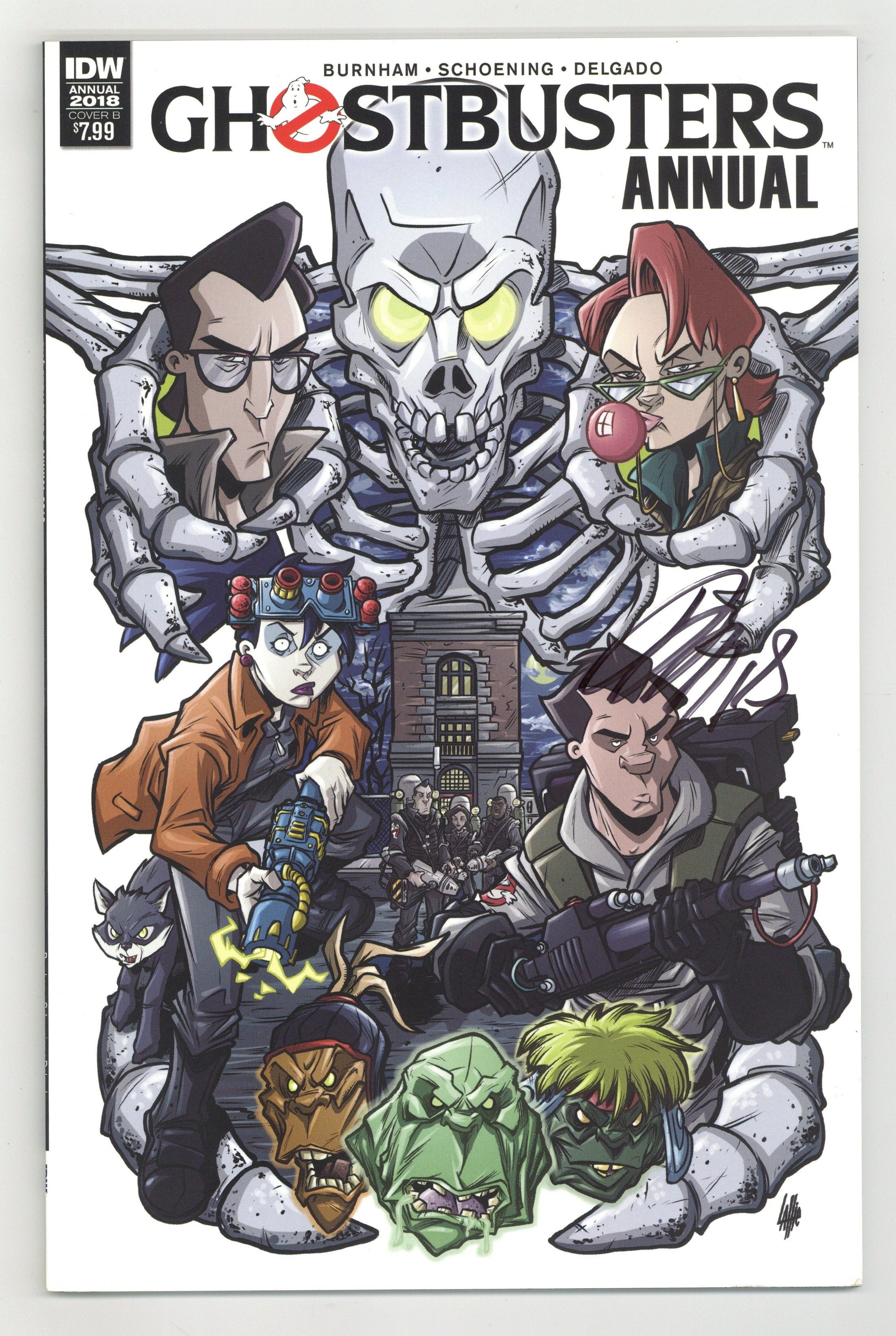 Written by Erik Burnham. Art by Dan Schoening. Cover by Tim Lattie. When urban miners discover what appears to be a centuries-old, man-made chamber 600 feet below the streets of New York City, they unwittingly unleash an unnamed entity with designs on dominance... an entity that will soon answer to the name SAMHAIN. Join the original Ghostbusters in this double-sized annual that will also sow the seeds for Crossing Over! 48 pages, full color. Cover price $7.99.