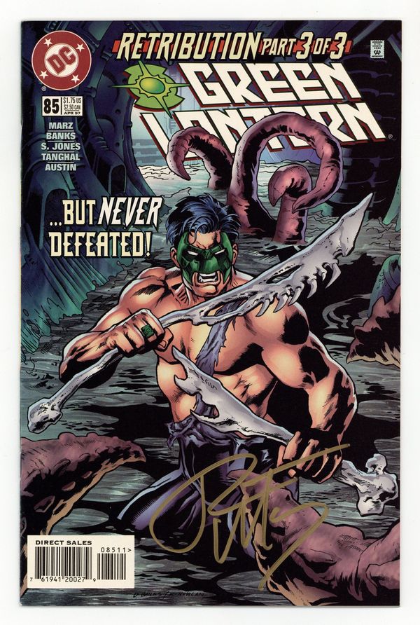 Retribution: Part 3 of 3. "Powerless...!" Cameos by John Stewart and Donna Troy. Story by Ron Marz. Art by Darryl Banks, Stephen J.B. Jones, Terry Austin, and Romeo Tanghal. Powerless and alone, can Kyle survive his deadly game of cat and mouse with Fatality, a deadly opponent who has made a living assassinating members of the Green Lantern Corps. Cover price $1.75.