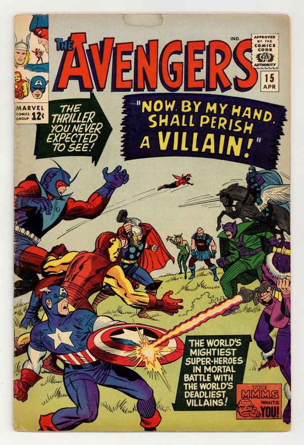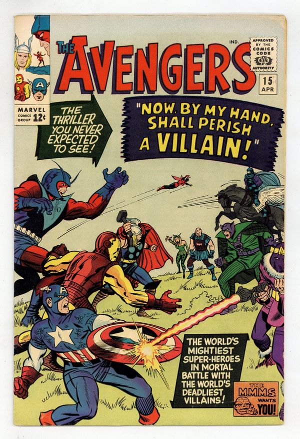 "Now, By My Hand, Shall Die a Villain!" Script by Stan Lee, layouts by Jack Kirby, pencils by Don Heck, inks by Mike Esposito (as Mickey Demeo). Avengers Roll Call: Thor, Captain America, Iron Man, Giant Man, Wasp, and Rick Jones. Villains: the first Baron Zemo, the Enchantress, the Executioner, the Melter, the second Black Knight, and the first appearance of Zemo's Mercenaries (Erik Josten). Baron Zemo is killed when a laser ray, he fires, reflects off of Captain America's shield and causes an avalanche that buries the baron underneath a ton of rock. Reprinted in Marvel Triple Action # 9. Kirby/Chic Stone cover. 36 pgs. Cover price $0.12.