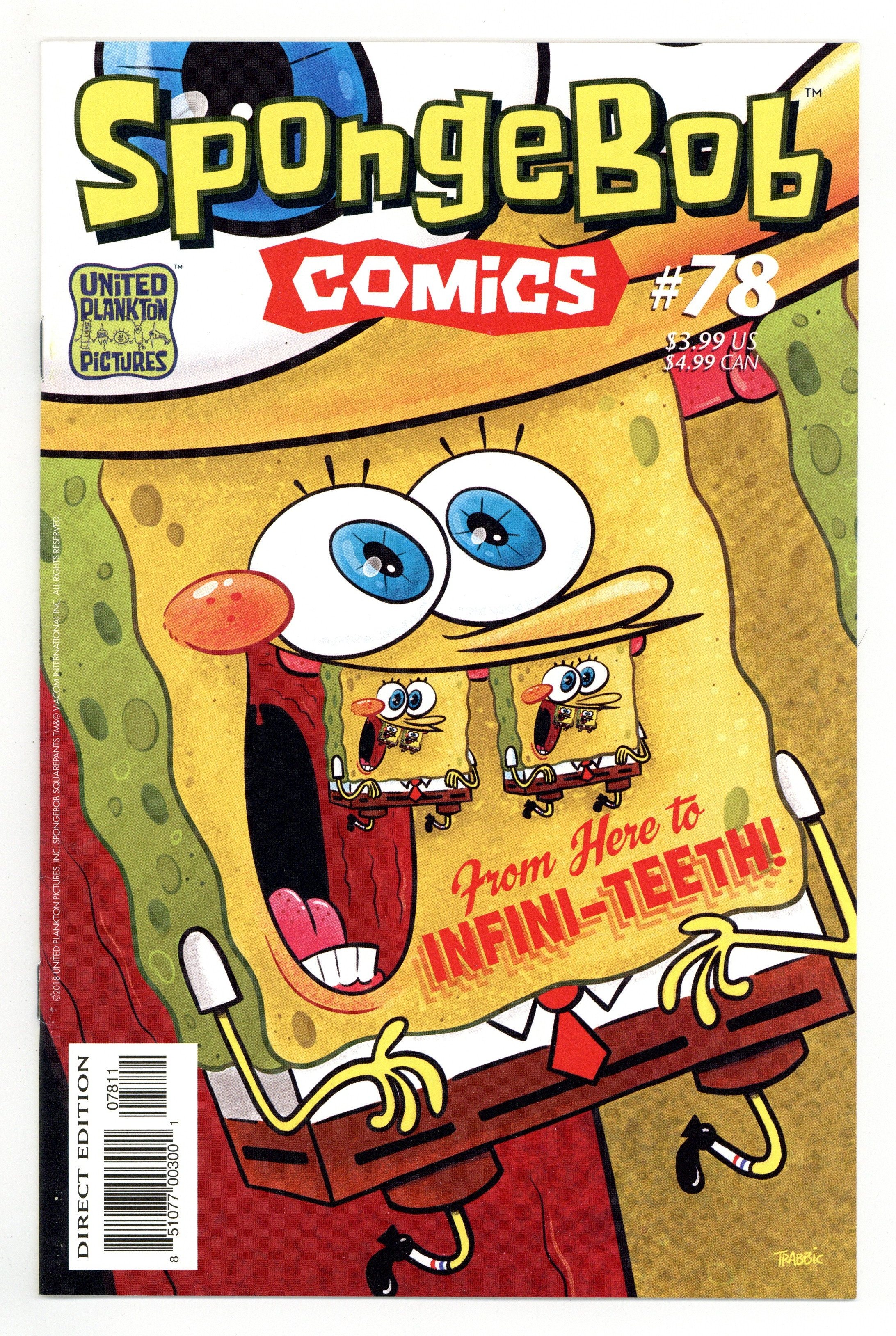 Published Feb 2018 by United Plankton Pictures.$23.00Story and Art by John Trabbic and Brian Smith. Cover by John Trabbic. Freak circumstances conspire to make SpongeBob's buck teeth grow out-of-control-threatening to demolish, or at least radically redesign, the Krusty Krab as we know it! Can Sponge-Bob's friends avoid dental disaster and knock his choppers down to size? Find out in 'Healthy Teeth' by hot SpongeBob storyboard artist John Trabbic! Plus, delightful detail-meister Brian Smith (Tree Friends) brings you 'Mini-Golf Madness' - five spreads of spectacular bird's eye panel panoramas detailing Mr. Krabs and SpongeBob's journey through the ocean's finest mini-golf course! Plus: 'SpongeFunnies' by James Kochalka, ocean facts from Maris Wicks, and more! 32 pages, full color. Cover price $3.99.