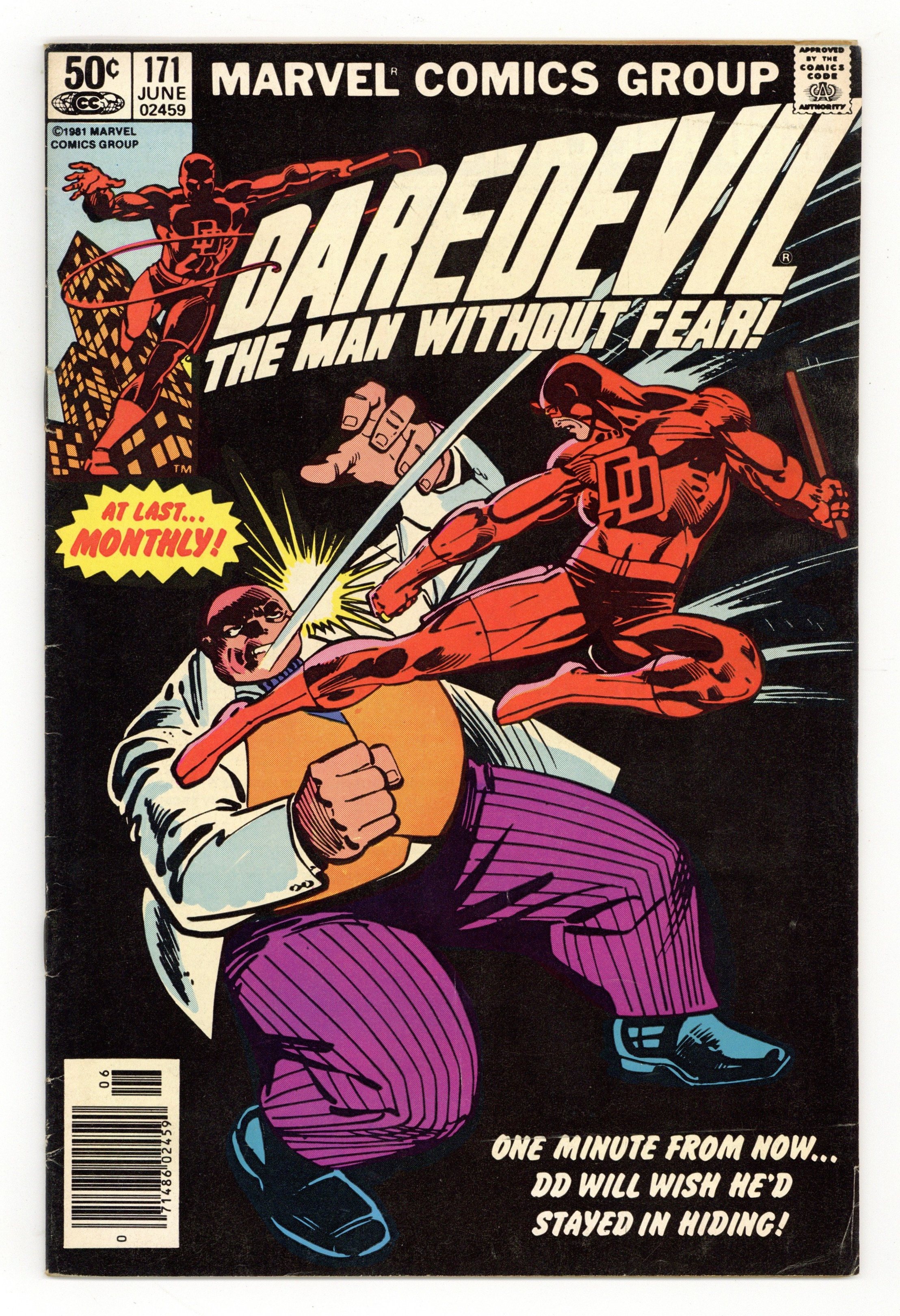 Direct Edition. Cover pencils by Frank Miller, inks by Klaus Janson. In the Kingpin's Clutches, script and pencils by Frank Miller, inks by Klaus Janson; Matt goes undercover and joins the Kingpin's gang so he can steal the info Fisk has collected on the underworld; Kingpin catches him in the act and beats him senseless; During the Kingpin's exchange with the men holding his wife, Vanessa is apparently killed; this issue marks the first actual meeting between DD and The Kingpin. 32 pgs. Cover price $0.50. Cover price $0.50.