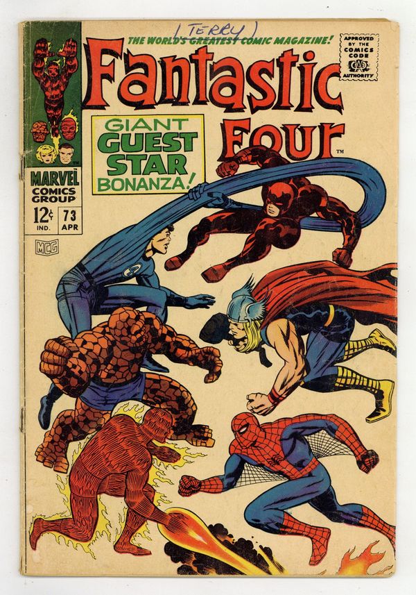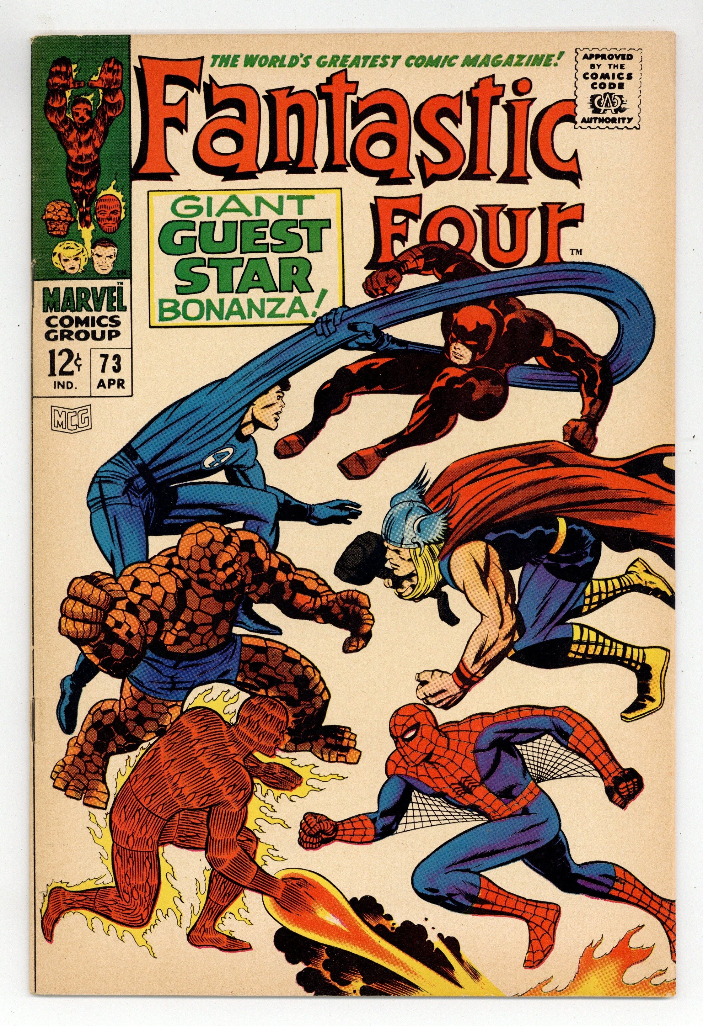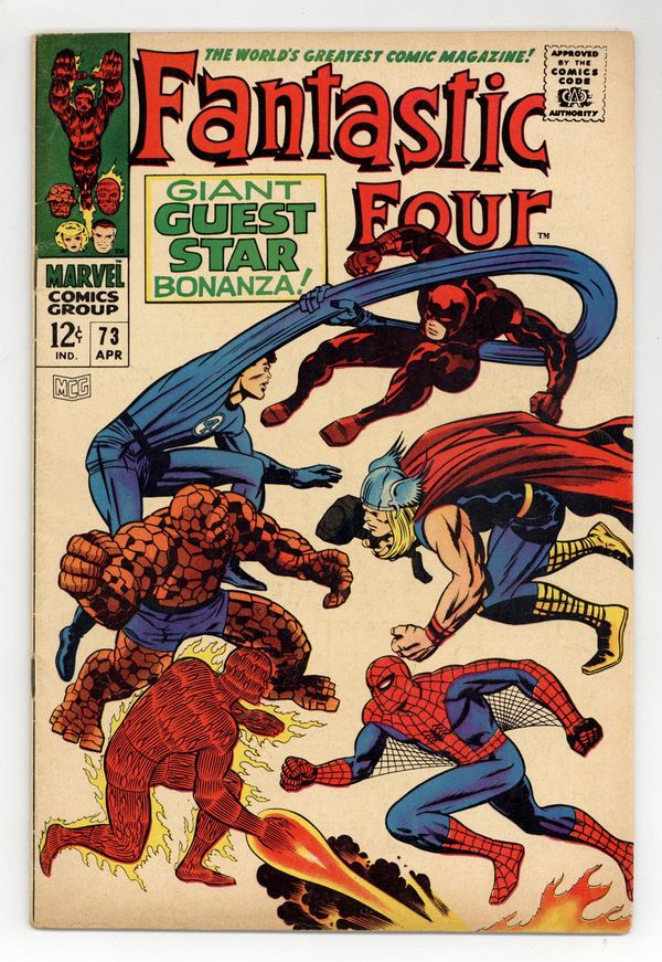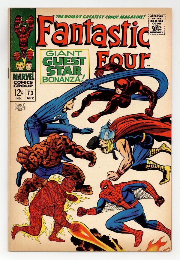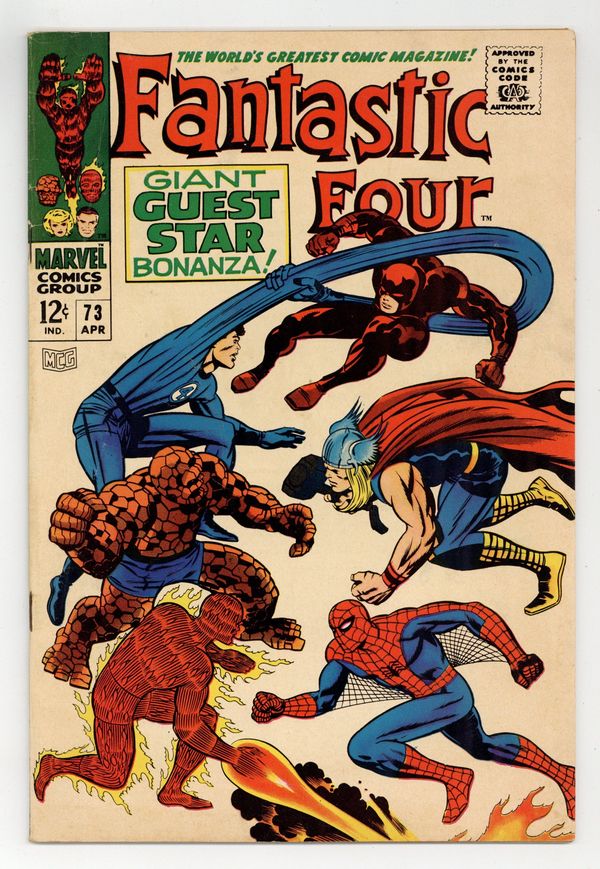 Cover pencils by Jack Kirby, inks by Joe Sinnott. Daredevil, Thor, and Spider-Man guest star in The Flames of Battle, script by Stan Lee and Jack Kirby (co-plot), pencils by Jack Kirby, inks by Joe Sinnott; Thinking that Dr. Doom still inhabits Daredevil's body, the FF go after Daredevil who has gained some super-powered allies of his own. House ad for Not Brand Echh #7 and Daredevil #38. Statement of Ownership, Management and Circulation; Average number of copies during preceding 12 months: 329,536. This story continues from Daredevil 38. Reprinted in Marvel's Greatest Comics # 55. 36 pgs. $0.12. Cover price $0.12.
