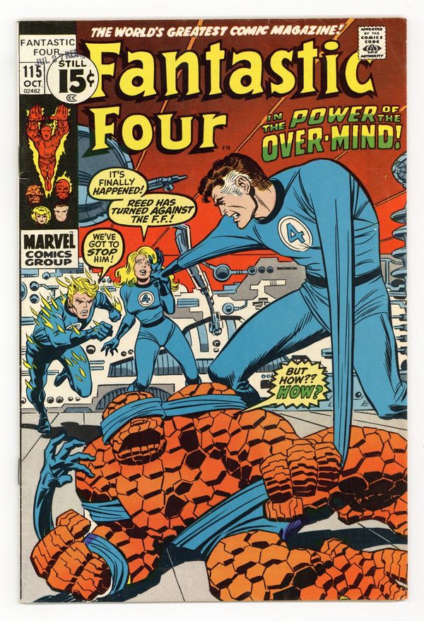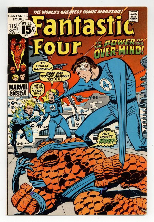 "The Secret of the Eternals" Part 3 of 4. Plot by Stan Lee. Script by Archie Goodwin. Pencils by John Buscema. Inks by Joe Sinnott. Cover by John Buscema, Frank Giacoia, and John Romita (touch-ups). The Watcher tells the FF the incredible origin of the Over-Mind! But Reed, Sue, Ben, and Johnny don't remember fighting the Eternals' powerful warlord last issue. Did the foursome somehow forget? When Mr. Fantastic starts to put two and two together, the Over-Mind strikes! And now a possessed Reed Richards attacks his teammates and embarks on a mission of conquest for the Over-Mind! Last 15¢ issue. (Note: This issue includes a full-page ad for the first issue of Marvel Feature (1st series) starring the Defenders.) 36 pages Cover price $0.15.