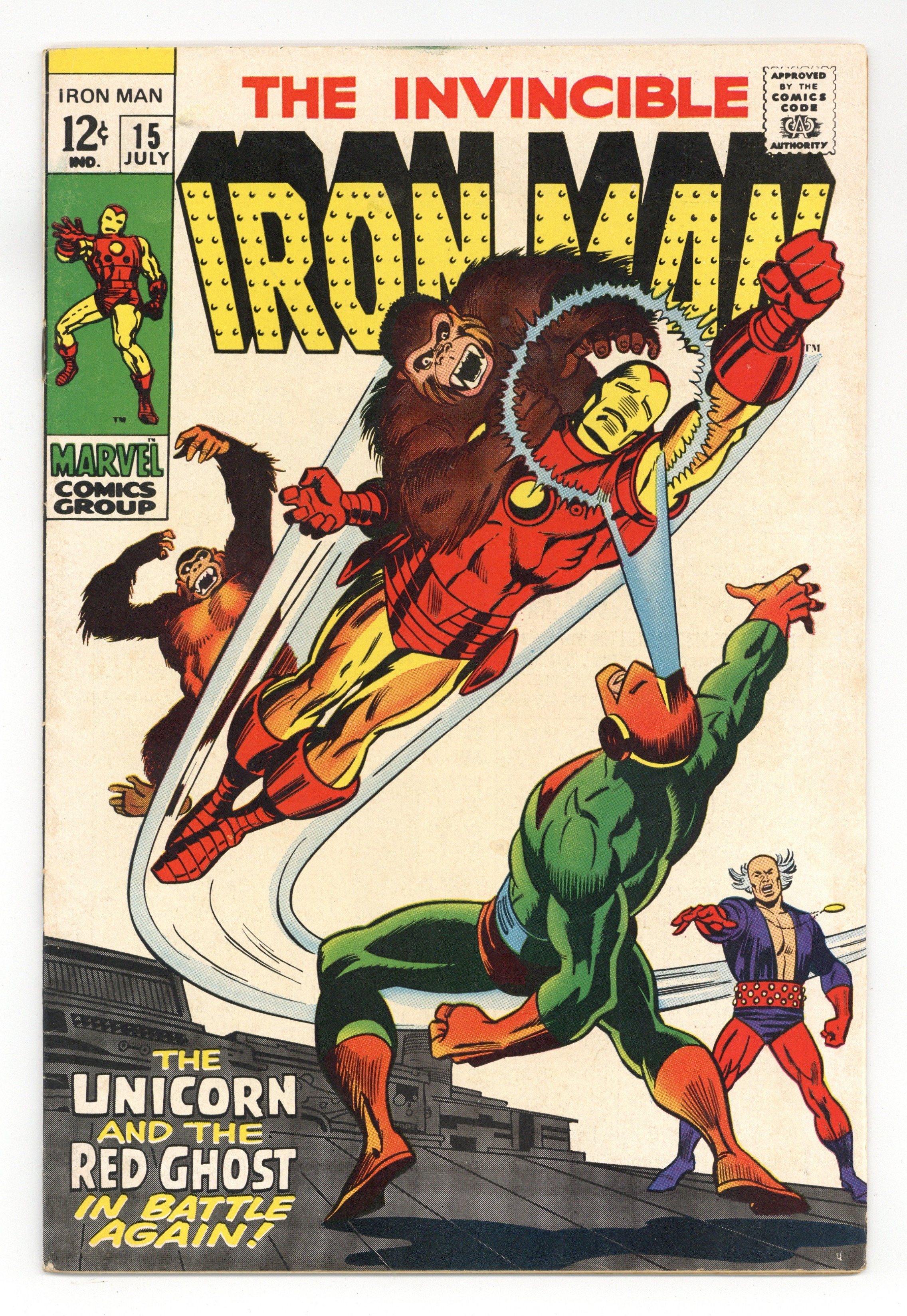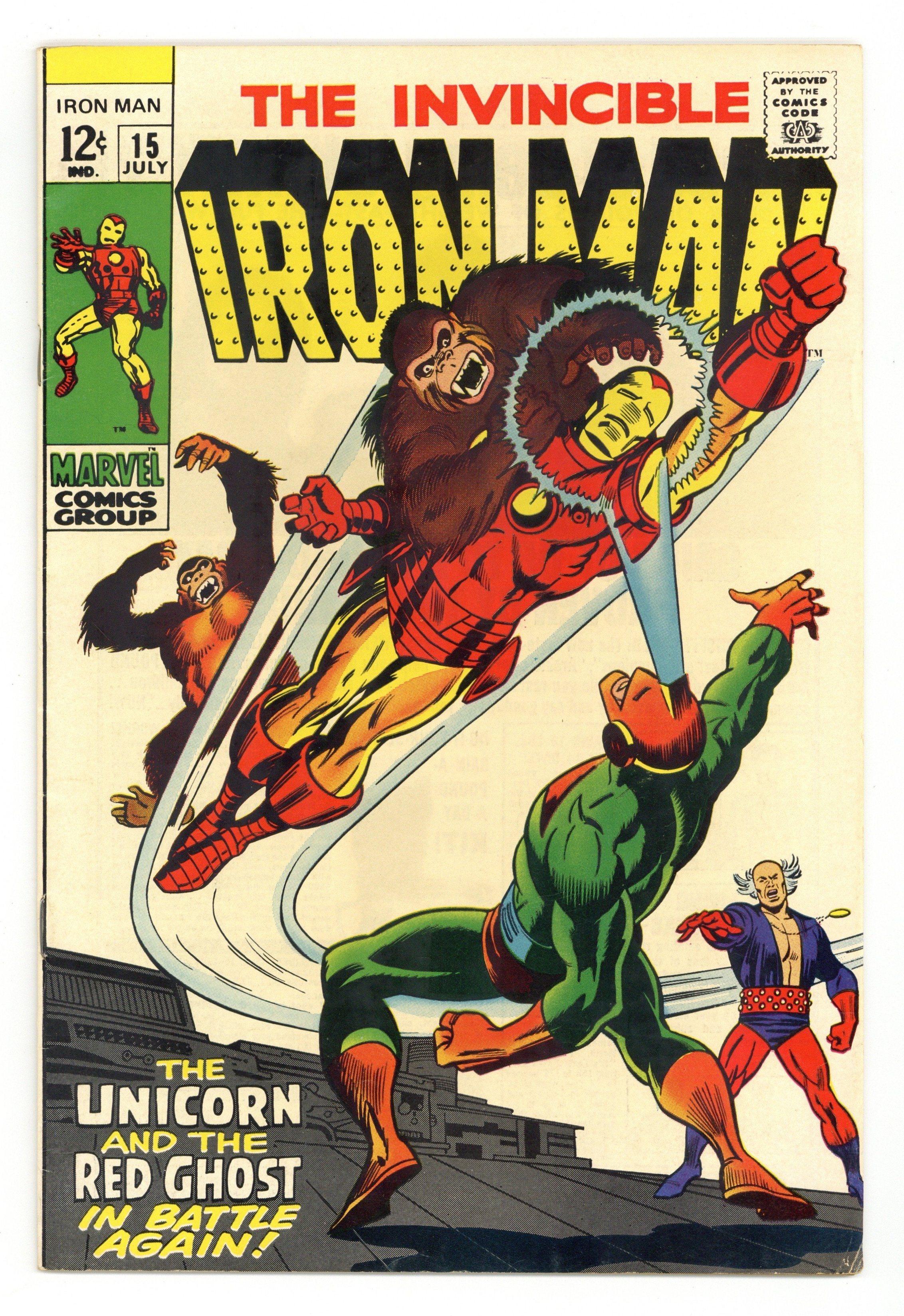 Tags: Marvel Legacy Numbering: Iron Man (part 15), Iron Man$21.00"Said the Unicorn to the Ghost!" Story by Archie Goodwin. Art by George Tuska and Johnny Craig. The Red Ghost has helped the Unicorn (last seen in Iron Man 4) regain his powers and sanity following his defeat at the hands of Iron Man several months ago. Now the deadly duo travels to the Nevada desert to steal Tony Stark's cosmic ray intensifier! However, Shell-head is there to stop them! It's a great battle among Iron Man, the Unicorn, the Red Ghost, and the Super Apes! Meanwhile, Cord Manufacturing is reopening with Janice Cord as chief executive and Alex Niven as head scientist. First appearance of Alex Niven (aka Crimson Dynamo). Last 12¢ issue. 32 pages Cover price $0.12.