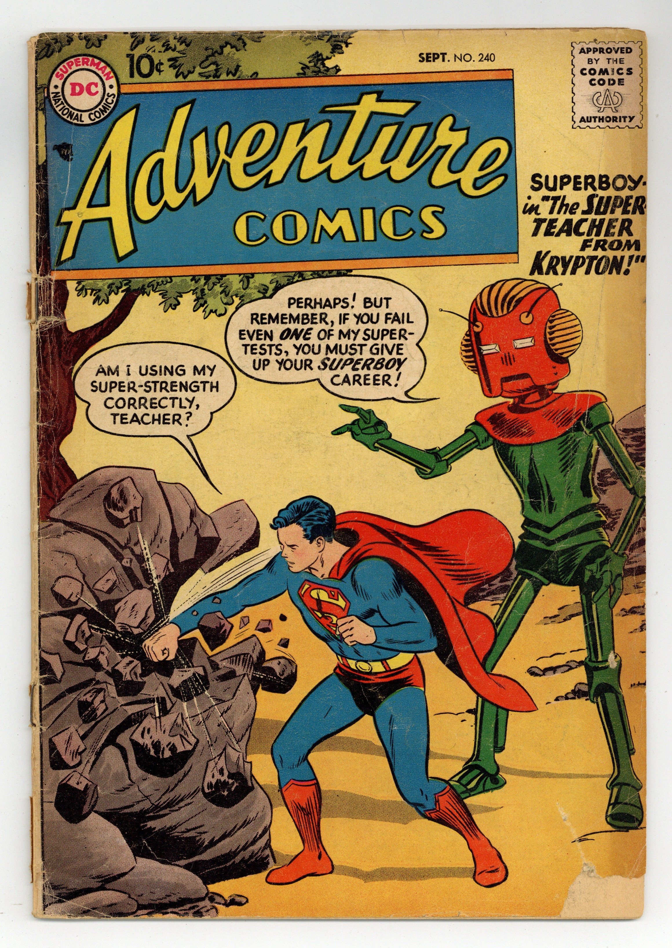 Cover pencils by Curt Swan, inks by Stan Kaye. The Super-Teacher from Krypton, script by Edmond Hamilton, art by John Sikela; A robot teacher constructed by Jor-El comes to Earth to decide if Superboy is worthy of his powers. Arrows -- for Hire, art by George Papp; Oliver's investments go bad, so Green Arrow and Speedy have to earn money to pay the mortgage on the Arrow Cave. So You Want to Be a Pilot article. Lucky humor page by Henry Boltinoff. The Alphabet Book of the Sea starring Aquaman, art by Ramona Fradon. 36 pages, Full Color. Cover price $0.10.
