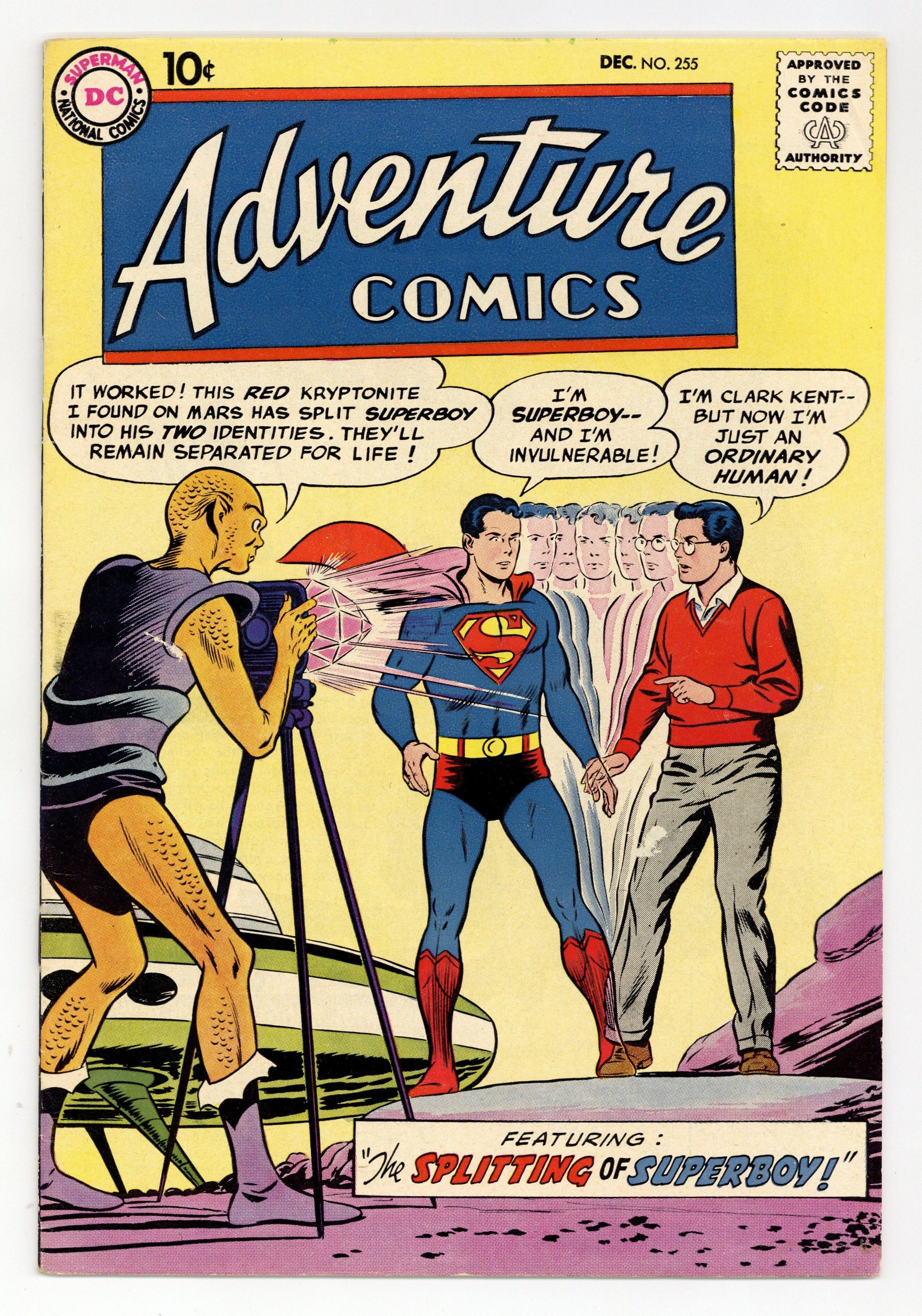 Cover pencils by Curt Swan, inks by Stan Kaye. The Splitting of Superboy, script by Otto Binder, art by George Papp; Kozz of Mars uses Red Kryptonite to split Superboy and Clark into two separate people. But Clark turns out to be evil. Casey the Cop humor page by Henry Boltinoff. Blackhawk #132 ad. The War That Never Ended!, script by Dave Wood, pencils by Jack Kirby, inks by Jack Kirby and Roz Kirby (backgrounds); Green Arrow and Speedy are stranded on a Pacific island that is still inhabited by Japanese soldiers who do not know that WWII is over. Aquaman's Double Trouble starring King Neptune, art by Ramona Fradon. 36 pages, Full Color. Cover price $0.10.