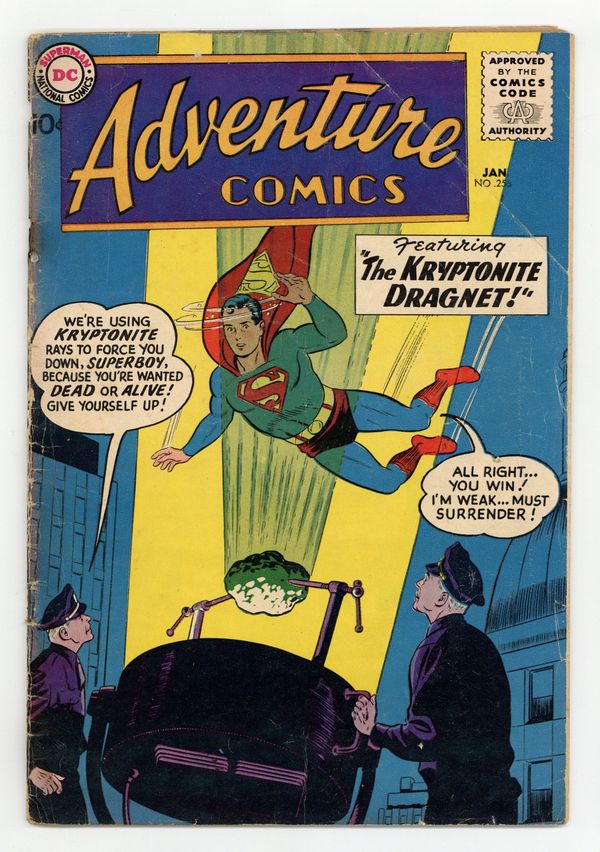 Cover pencils by Curt Swan, inks by Stan Kaye. The Dragnet For Superboy starring Chief James Wilton, "Flash" Ward, and Pa Kent, script by Otto Binder, art by Al Plastino. The Ordeal of Aquaman starring Topo, art by Ramona Fradon. Varsity Vic humor page by Henry Boltinoff. The Green Arrow's First Case, script by Ed Herron, pencils by Jack Kirby, inks by Jack Kirby and Roz Kirby (backgrounds); Oliver Queen is marooned on Starfish Island, where he hones his skills as an archer and develops trick arrows. When an expedition sets out to explore the island years later, he fools them with his fake-uranium arrow. 36 pages, Full Color. Cover price $0.10.