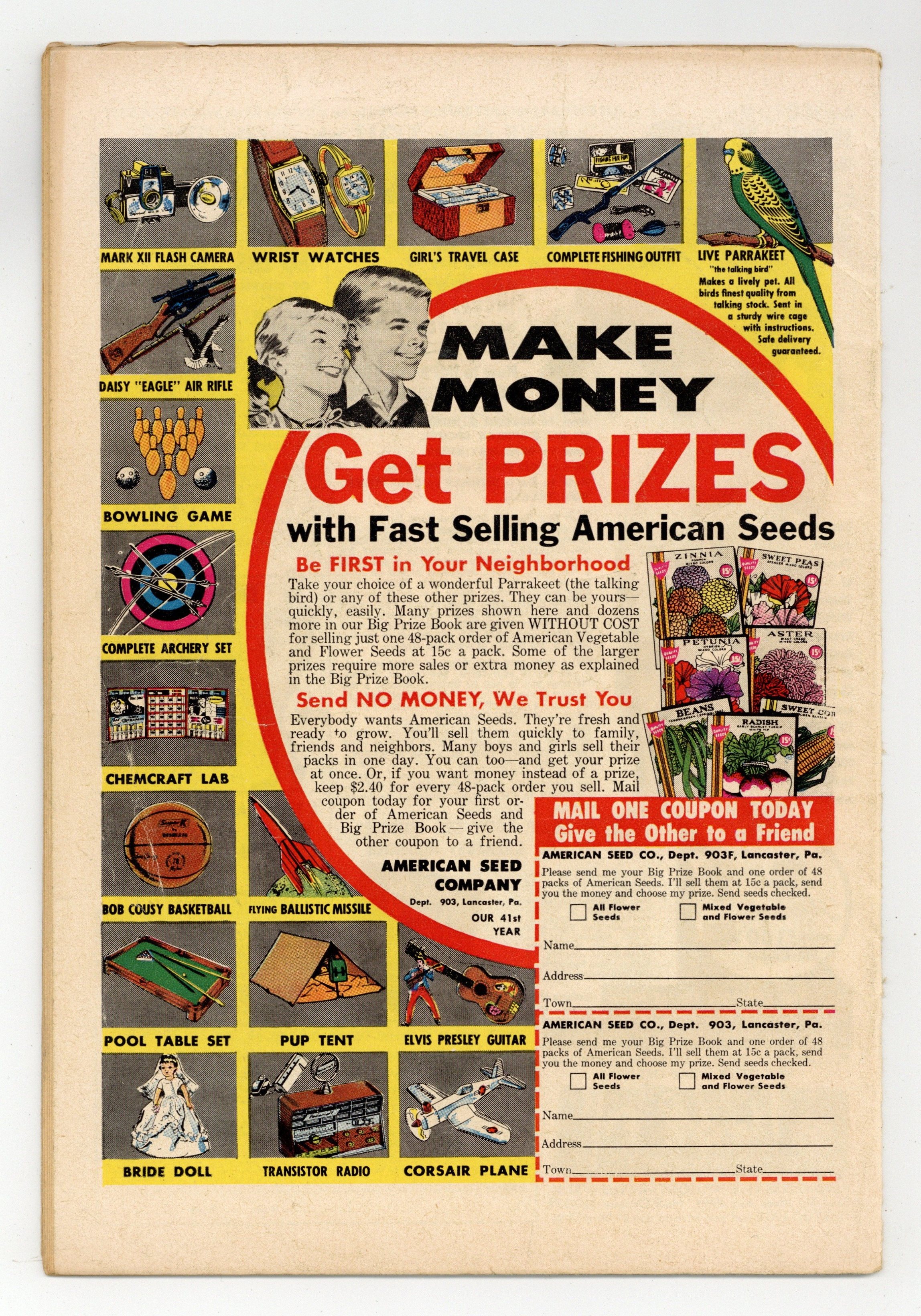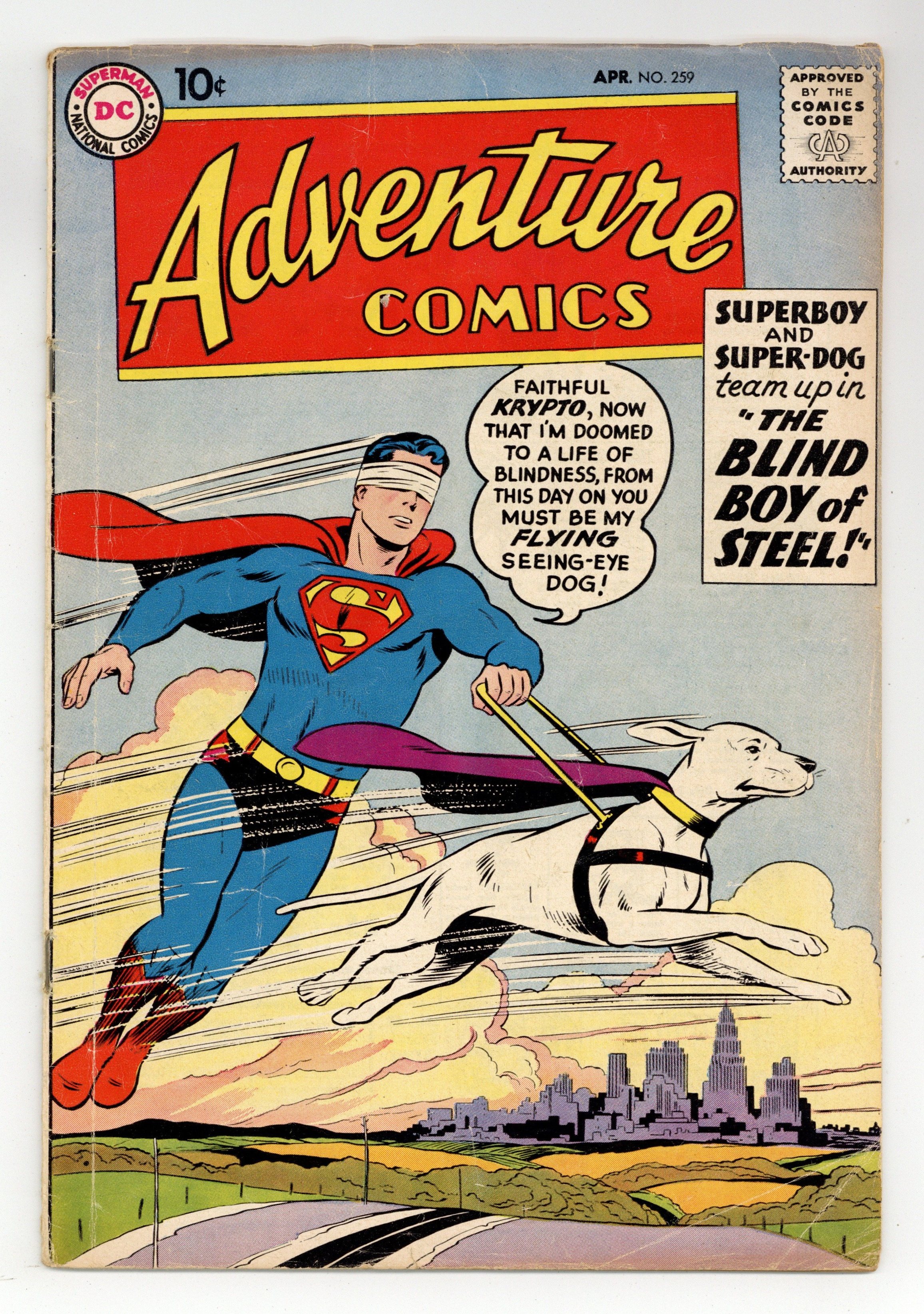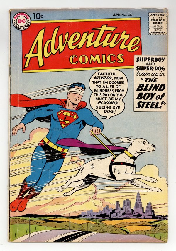 $46.00Cover pencils by Curt Swan, inks by Stan Kaye. The Blind Boy of Steel, script by Otto Binder, art by George Papp; A freak bolt of lightning strikes a meteor containing kryptonite, catching Superboy in the blast and giving him diamond vision which he can't turn off, so he must keep his eyes shut at all times. Tricksy, World's Greatest Stunt Man humor page by Henry Boltinoff. Action Comics #252 ad. The Octopus Man, art by Ramona Fradon; Roland Peters has constructed a brain-wave transmitter and is experimenting on illegally captured sealife when Aquaman arrives and releases his finny friends. The Green Arrow's Mystery, art by Lee Elias. 36 pages, Full Color. Cover price $0.10.