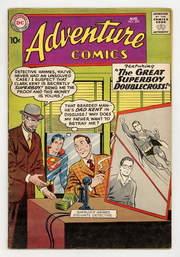 Cover pencils by Curt Swan, inks by Stan Kaye. The Great Superboy Doublecross, script by Otto Binder, art by John Sikela; Dad Kent hires a private detective to discover Superboy's secret identity. Have Arrow--Will Travel! starring Green Arrow, script by Robert Bernstein, art by Lee Elias; Speedy takes up odd-jobs to raise money for a sailboat; Some crooks try to take advantage of Speedy but he catches onto their scheme. The Great Ocean Election! starring Aquaman, art by Ramona Fradon. 36 pages, Full Color. Cover price $0.10.
