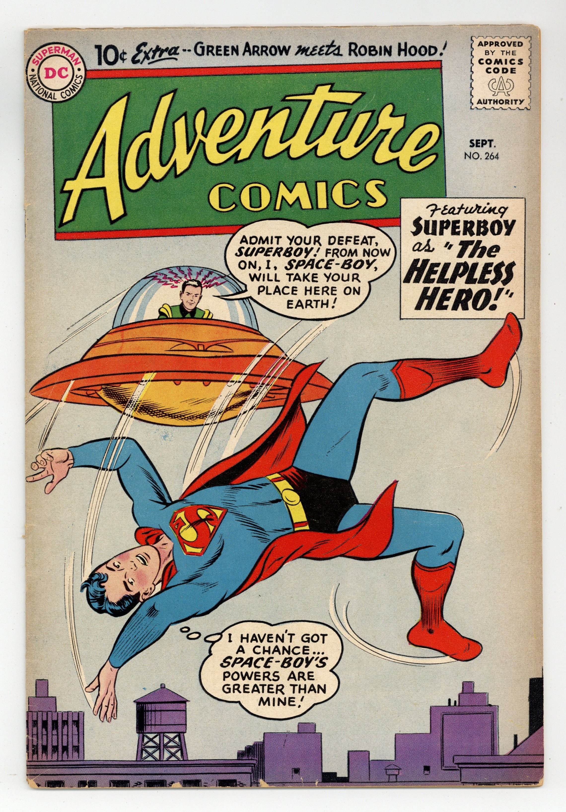 Cover pencils by Curt Swan, inks by Stan Kaye. The Helpless Hero, script by Otto Binder, art by George Papp; a boy from another planet schemes to take Superboy's place by causing all his powers to go haywire. Aquaman and His Sea-Policeman, art by Ramona Fradon; Aquaman helps out a city whose streets are all canals. Varsity Vic humor page by Henry Boltinoff. The Green Arrow Robin Hood!, art by Lee Elias; Green Arrow goes back in time and takes Robin Hood's place. 36 pages, Full Color. Cover price $0.10.