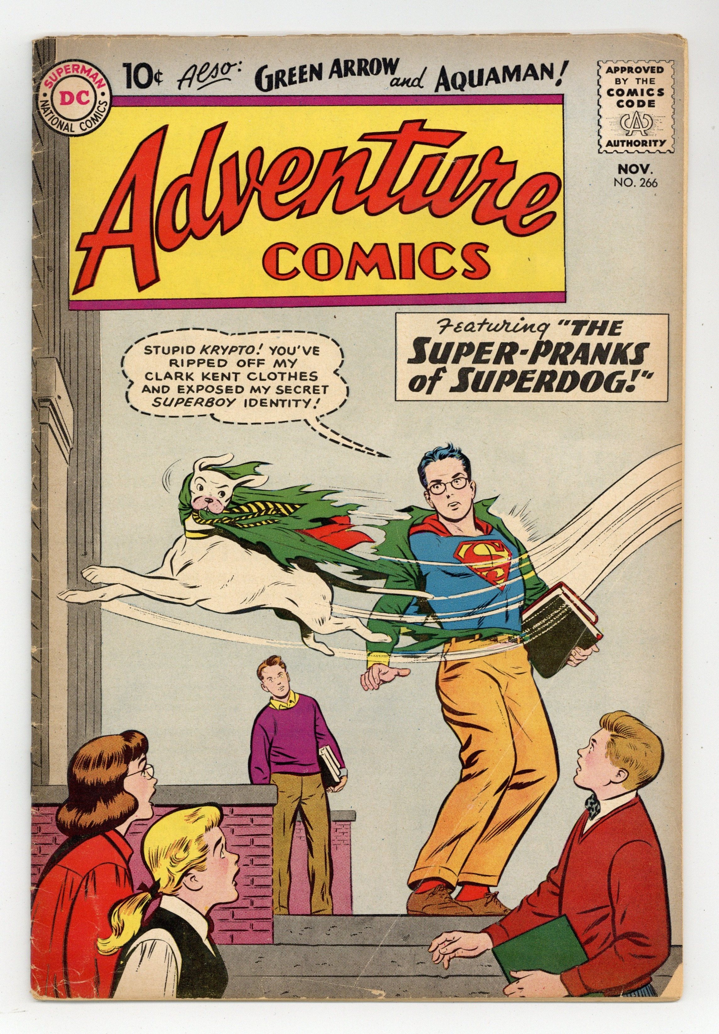 Cover pencils by Curt Swan, inks by Stan Kaye. The Super-Pranks of Krypto! starring Superboy, script by Jerry Siegel, art by George Papp; Krypto hounds Smallville with his practical jokes. Origin and first appearance of Aquagirl (tryout; not same as later character) in the Aquaman story Aquaman Meets Aquagirl!, script by Robert Bernstein, art by Ramona Fradon; Lisa Morel suddenly gains powers equal to Aquaman's and tries to become his partner. Little Pete humor page by Henry Boltinoff. The Case Of The Vanishing Arrows! starring Green Arrow, script by Robert Bernstein, art by Lee Elias. 36 pages, Full Color. Cover price $0.10.