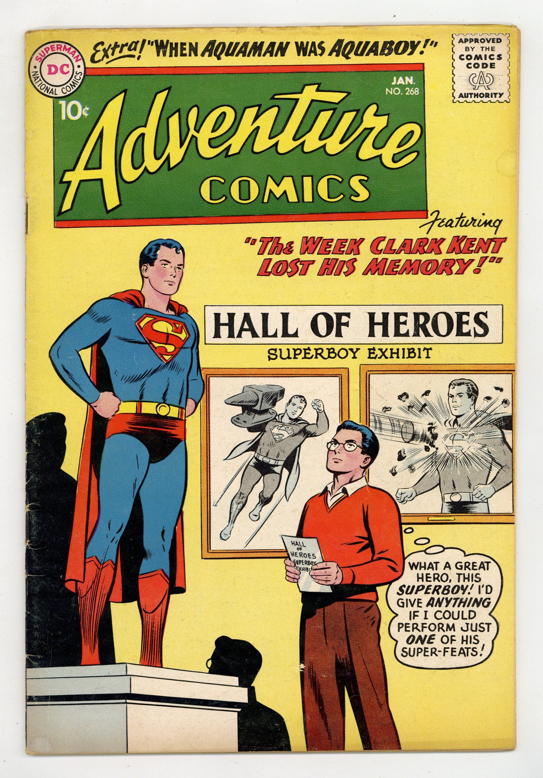 Cover pencils by Curt Swan, inks by Stan Kaye. The Week That Clark Kent Lost His Memory!, script by Otto Binder, art by Al Plastino; Red Kryptonite causes Superboy to lose his memory and leaves him stranded far from home. Green Arrow In King Arthur's Court!, art by Lee Elias; Green Arrow and Speedy both dream that they are back in the time of King Arthur; Or was it more than a dream? The Adventures of Aquaboy! starring Aquaman, script by Robert Bernstein, art by Ramona Fradon. 36 pages, Full Color. Cover price $0.10.