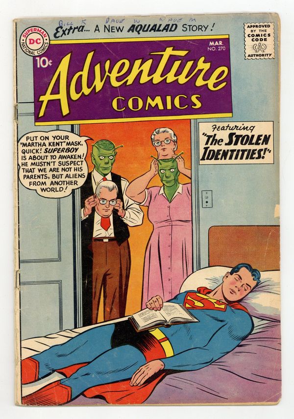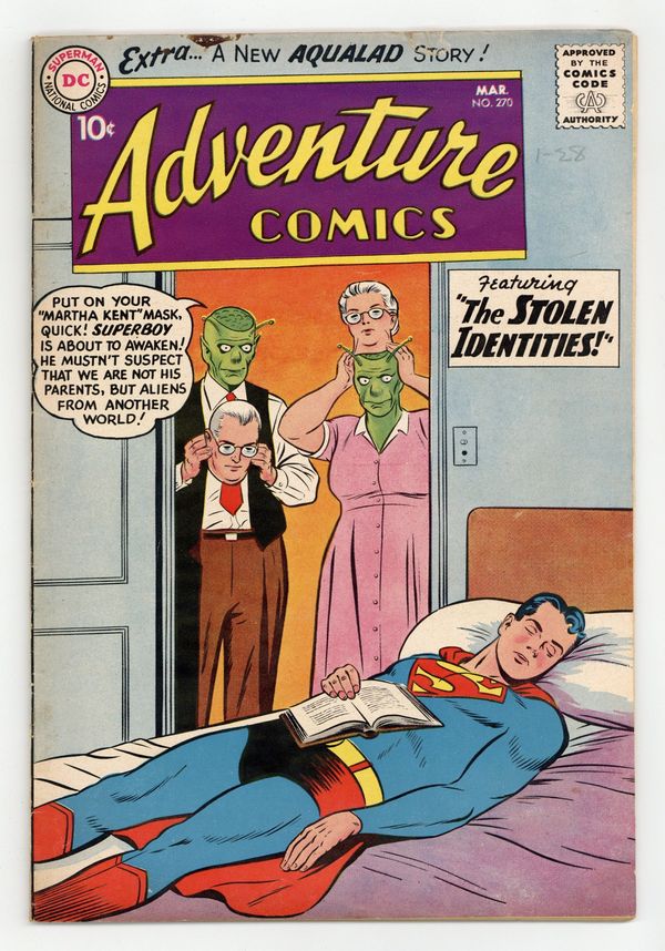 Cover pencils by Curt Swan, inks by Stan Kaye. The Stolen Identities, script by Jerry Siegel, art by George Papp; Two Xelthunians secretly replace Ma and Pa Kent to perform a secret mission, not knowing that the Kents are Superboy's foster parents; After Ma Kent unwisely mentions Superboy's vulnerability to kryptonite, the Xelthunians power the transporter ray they plan to use to send Superboy to their planet with red kryptonite and it turns him into a fat Boy of Steel, a bullet-sized Boy of Steel, and a giant Boy of Steel. The Ninth Wonder starring Congorilla, script by Robert Bernstein, art by Howard Sherman; In his Adventure Comics debut, Congorilla stops river pirates, frees a kidnapped scientist, and stops an attack by the Wambus, all before a retelling of his origin. Casey the Cop humor page by Henry Boltinoff. The Menace of Aqualad! starring Aquaman, script by Robert Bernstein, art by Ramona Fradon. 36 pages, Full Color. Cover price $0.10.