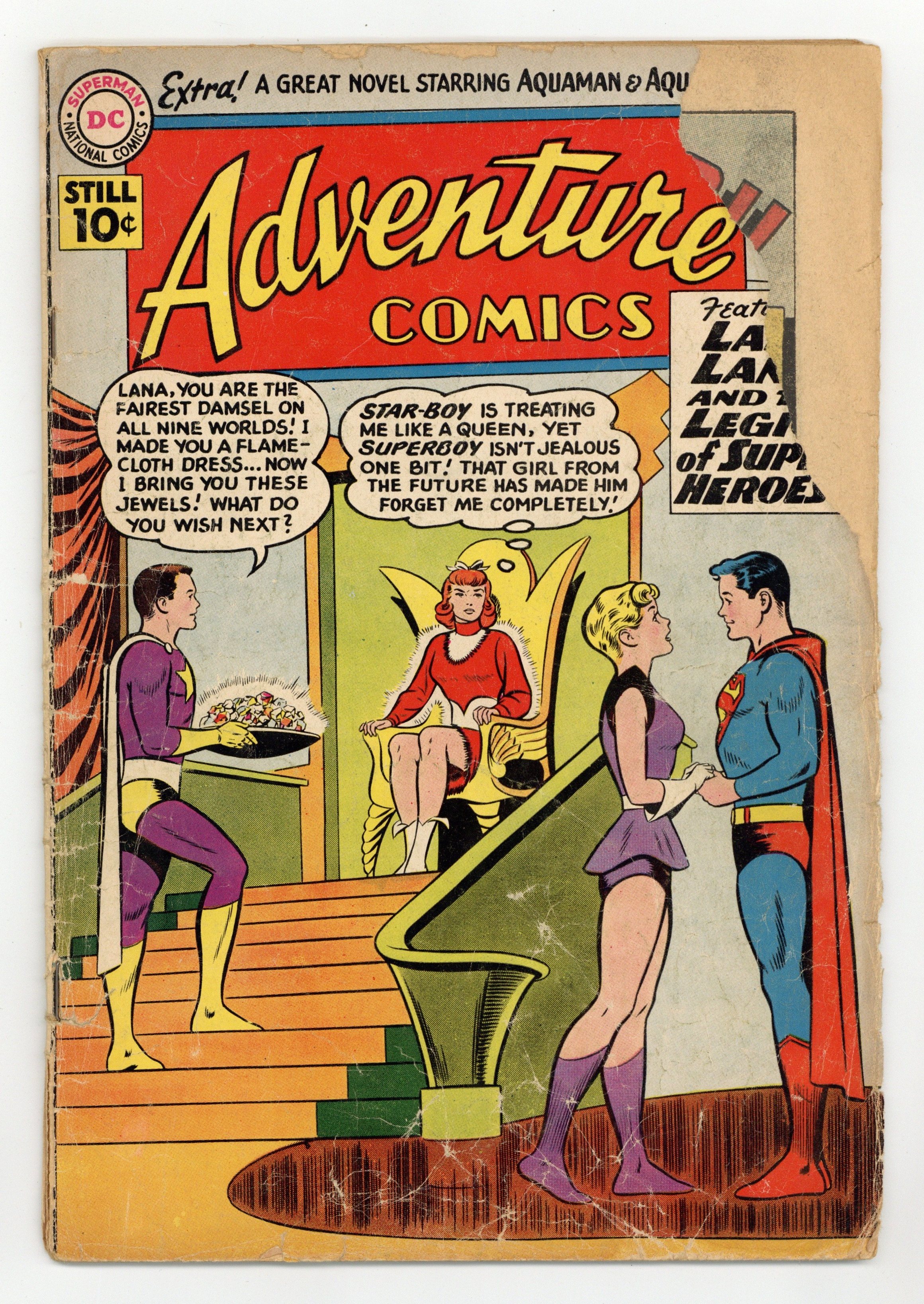 Cover pencils by Curt Swan, inks by Stan Kaye. 5th appearance Legion of Super-Heroes (intro Starboy) in Lana Lang and the Legion of Super-Heroes!, script by Otto Binder, art by George Papp; Lana uses Star Boy in an attempt to make Superboy jealous. One Hour to Doom!, script by Robert Bernstein, art by Ramona Fradon; Aquaman and Aqualad escape various one-hour-without-water traps. 36 pages, Full Color. Cover price $0.10.