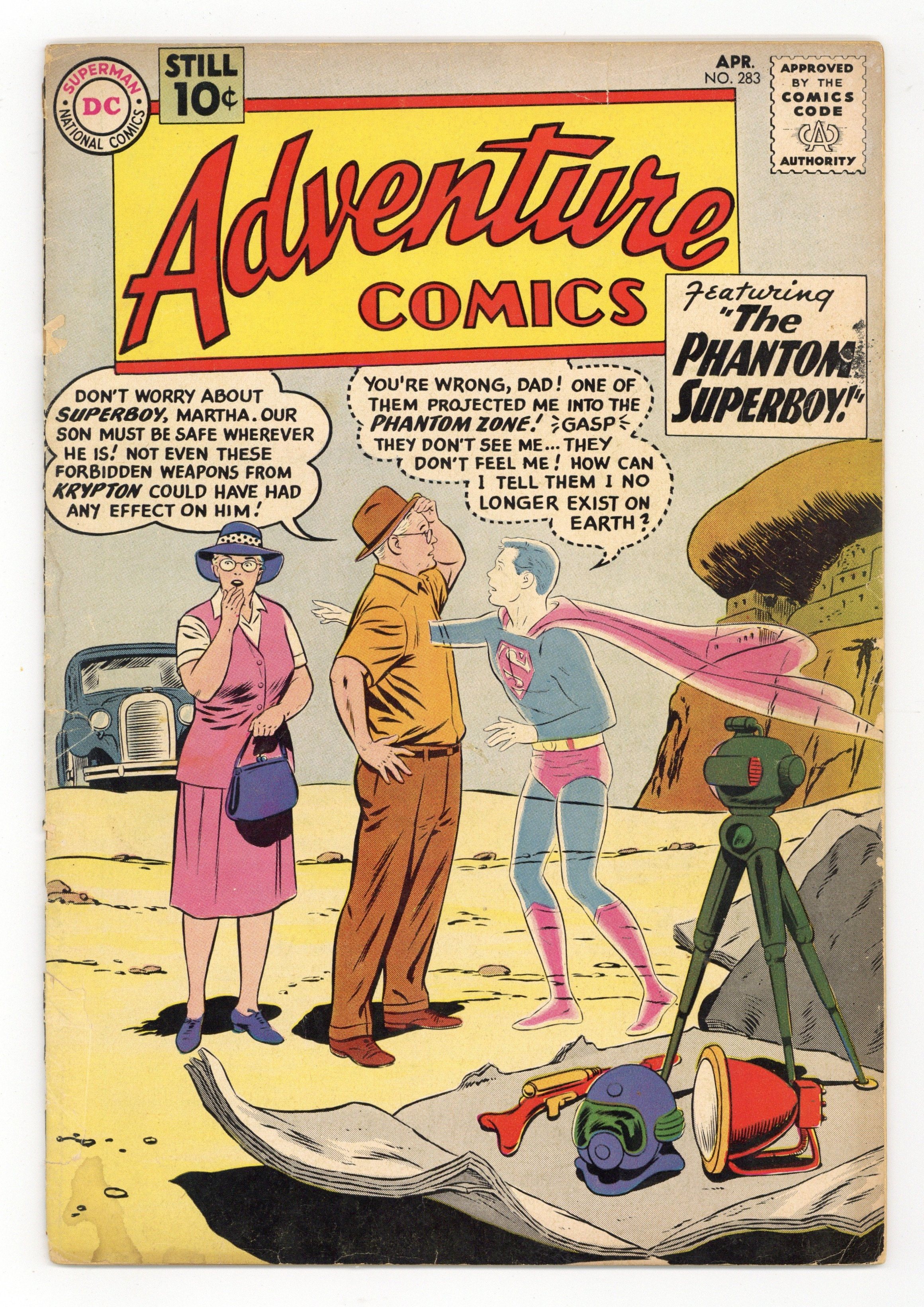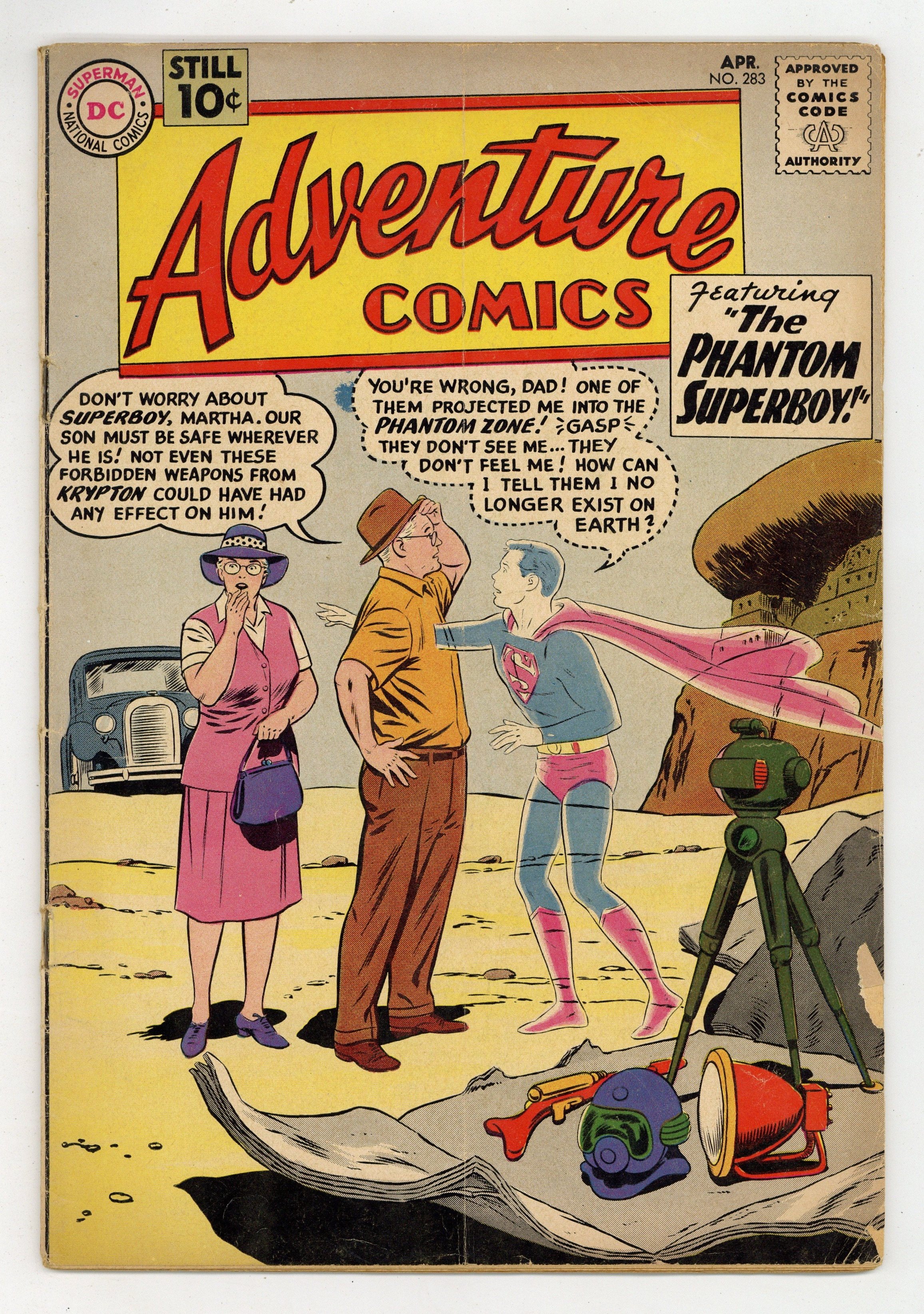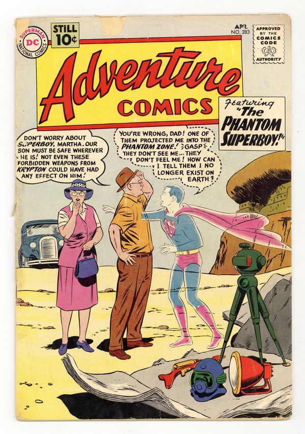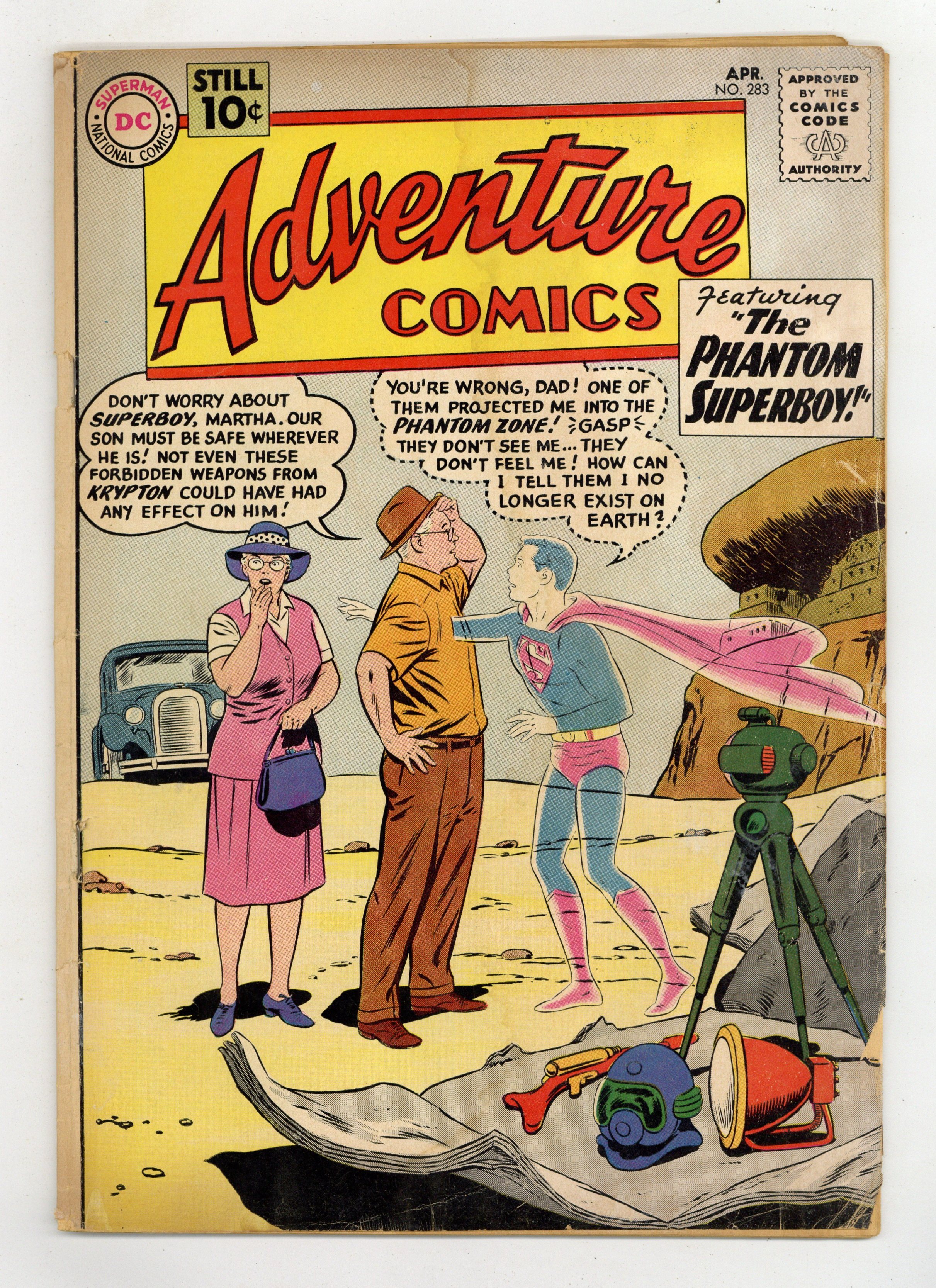 Cover pencils by Curt Swan, inks by Stan Kaye. 1st appearance of the Phantom Zone in The Phantom Superboy, script by Robert Bernstein, art by George Papp; After Professor Lang finds a box of Kryptonian weapons, Superboy is accidentally projected into the Phantom Zone, the place where Kryptonian criminals were exiled. A Salute to Our American Indians public service announcement, script by Jack Schiff, art by Bernard Baily. The Lion with the Double Identity starring Congorilla, script by Robert Bernstein, art by Howard Sherman. Little Pete humor page by Henry Boltinoff. 36 pages, Full Color. Cover price $0.10.