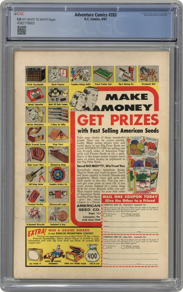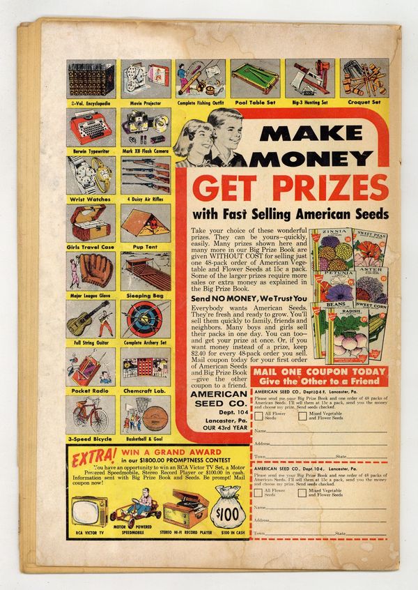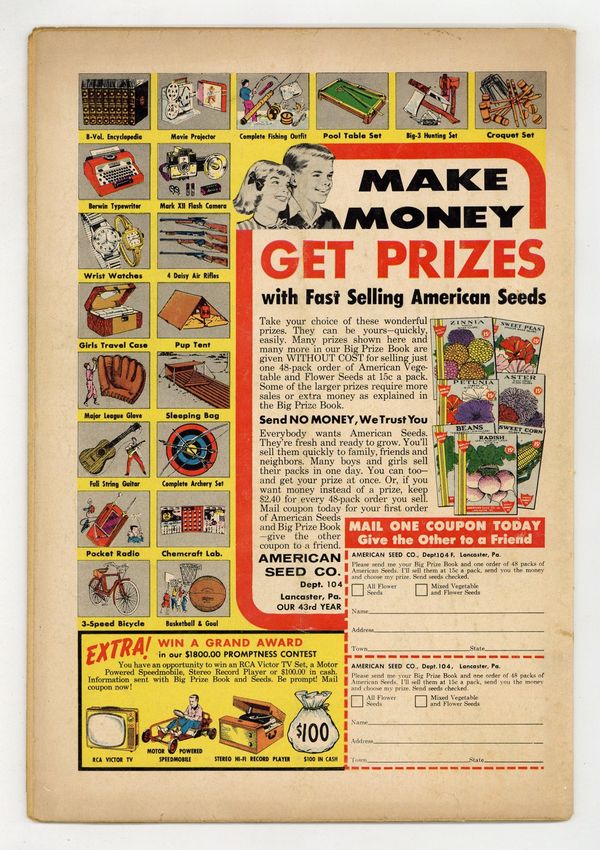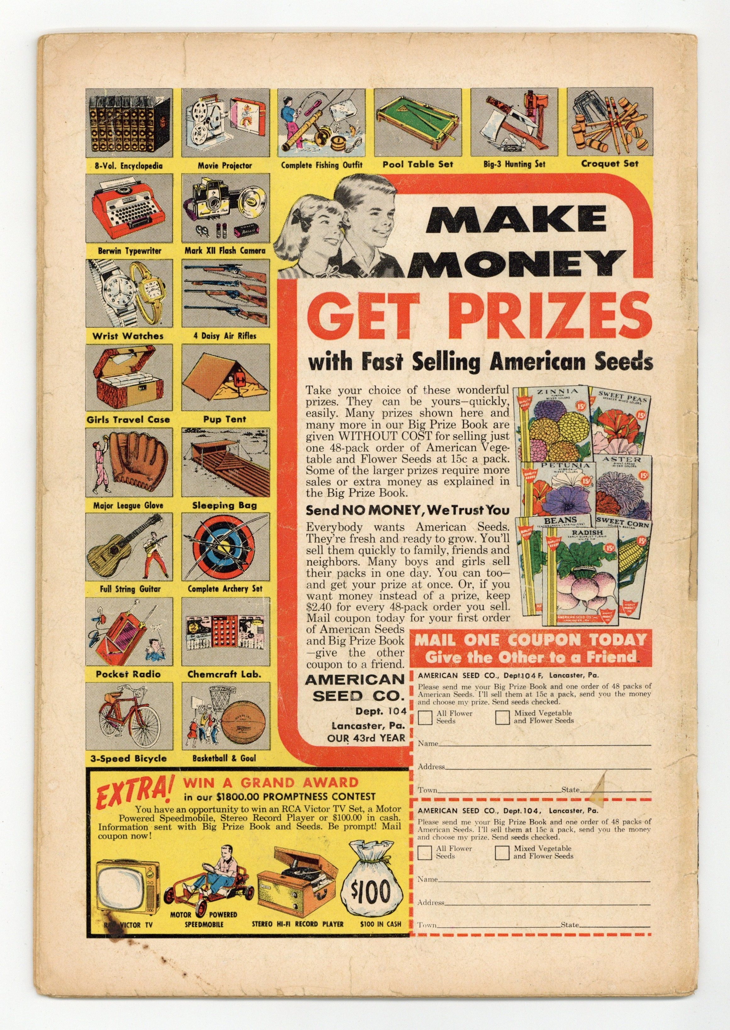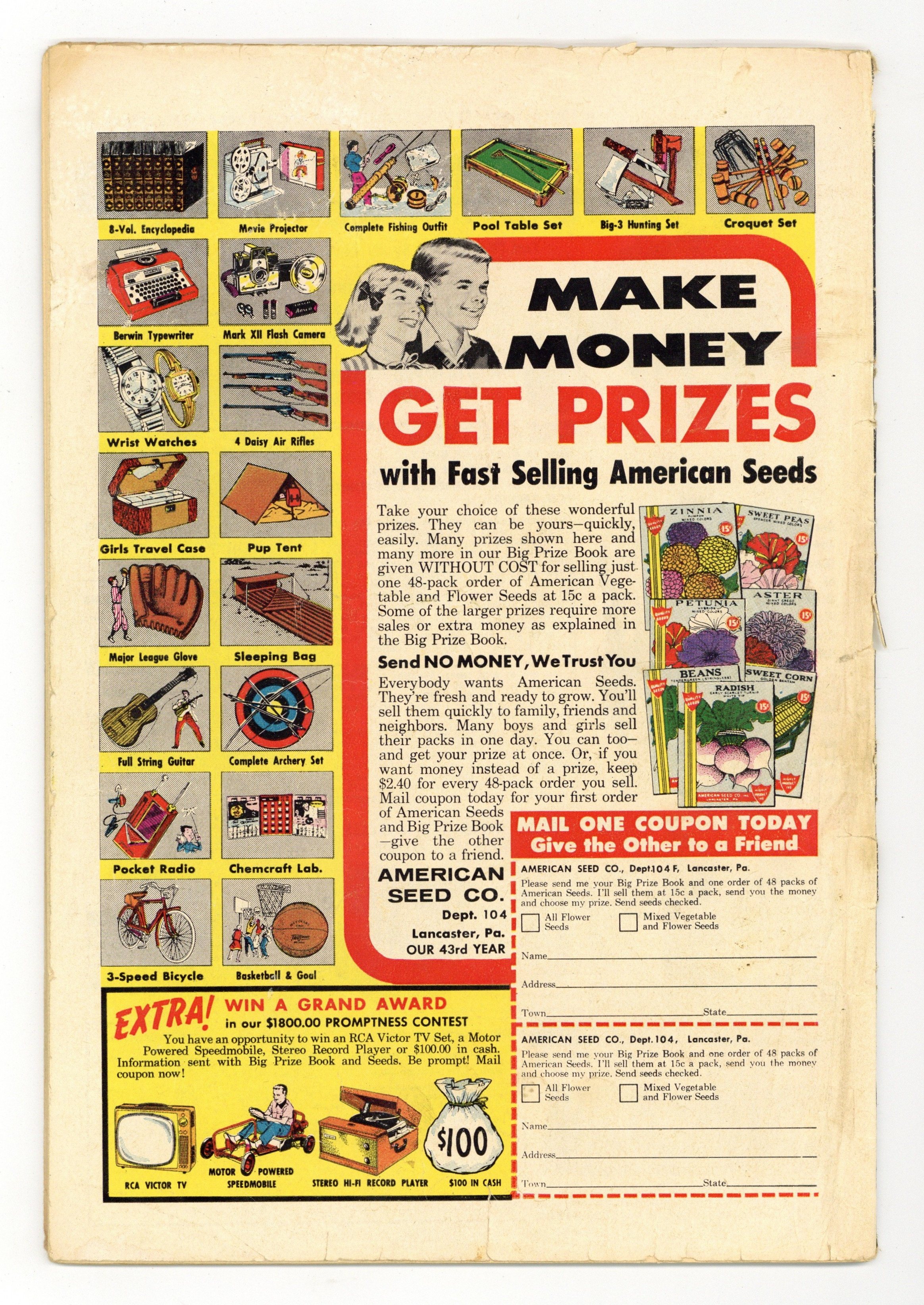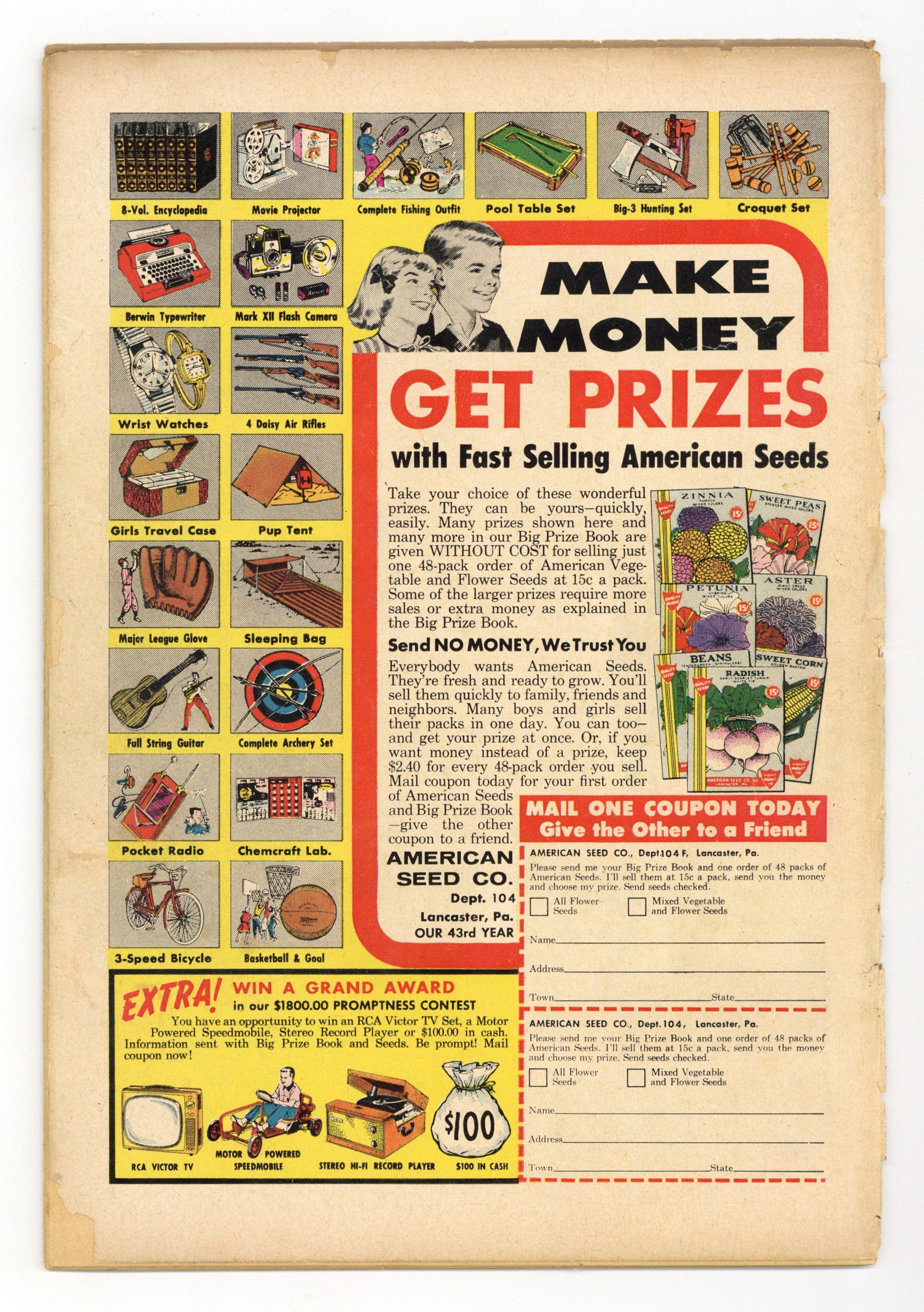 $145.00Cover pencils by Curt Swan, inks by Stan Kaye. 1st appearance of the Phantom Zone in The Phantom Superboy, script by Robert Bernstein, art by George Papp; After Professor Lang finds a box of Kryptonian weapons, Superboy is accidentally projected into the Phantom Zone, the place where Kryptonian criminals were exiled. A Salute to Our American Indians public service announcement, script by Jack Schiff, art by Bernard Baily. The Lion with the Double Identity starring Congorilla, script by Robert Bernstein, art by Howard Sherman. Little Pete humor page by Henry Boltinoff. 36 pages, Full Color. Cover price $0.10.