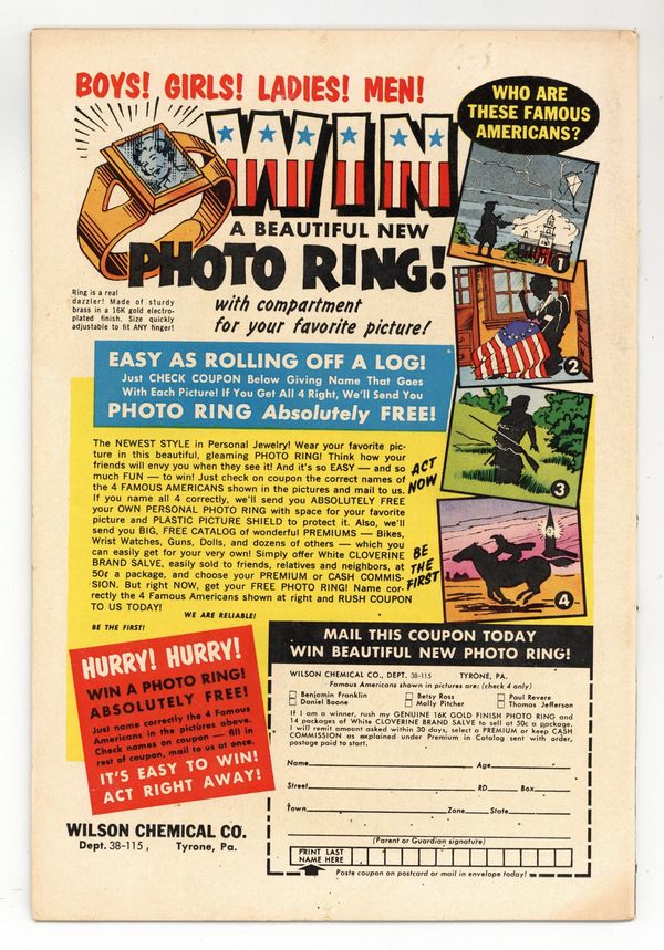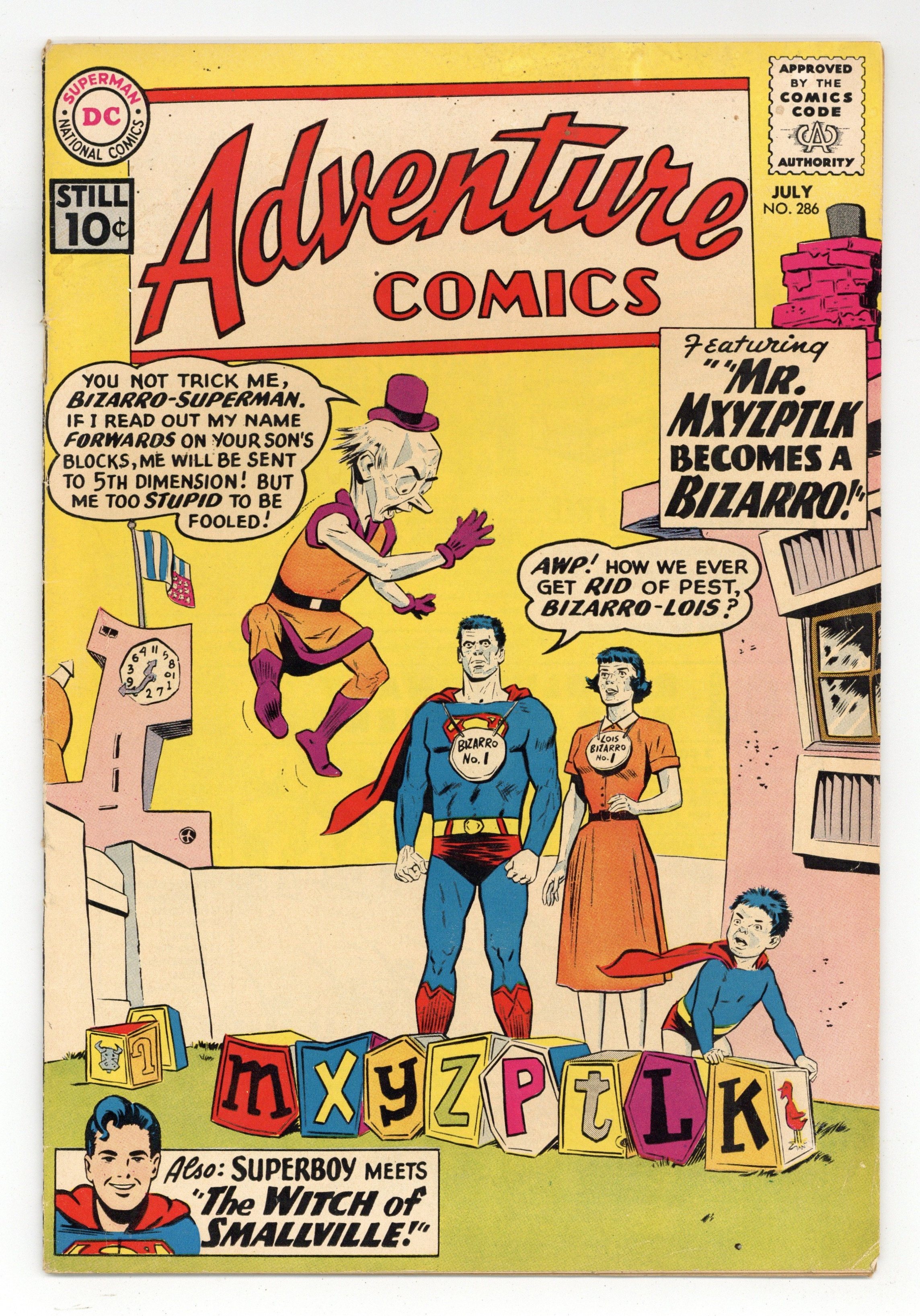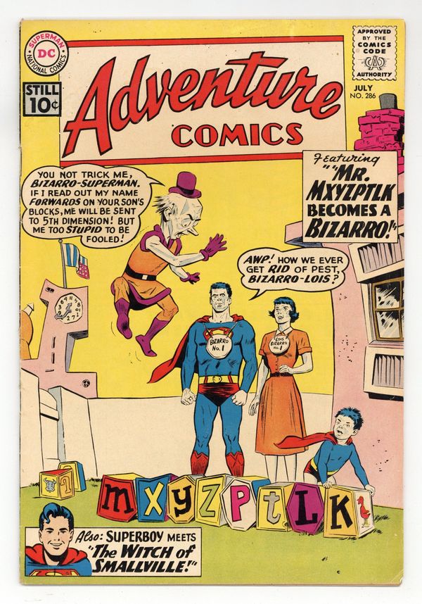 Tags: Bizarro$55.00Cover pencils by Curt Swan, inks by Stan Kaye. The Witch of Smallville, script by Robert Bernstein, art by Al Plastino; A witch terrorizes Smallville. Shorty humor page by Henry Boltinoff. Bizarro, Private Detective--Tales of the Bizarro World, script by Jerry Siegel, art by John Forte; Criminal makes pretty things on Bizarro World. 36 pages, Full Color. Cover price $0.10.