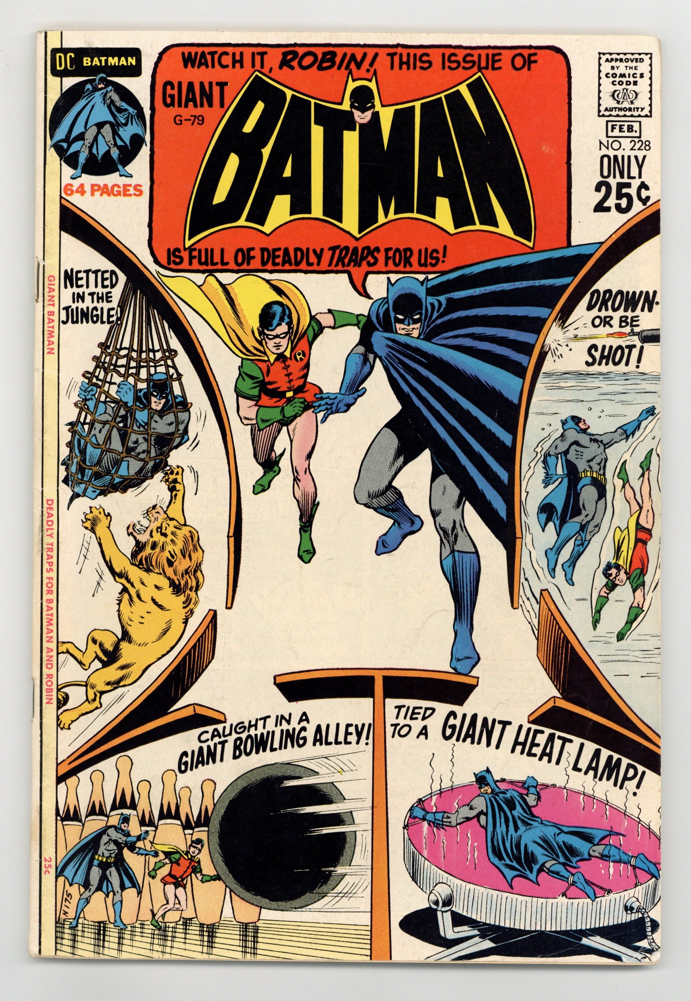 DC Giant G-79; Reprints include "Outlaw Town, U.S.A." (from Batman 75), "The Living Bat-Plane!" (from Batman 91), "The Duplicate Batman" (from Batman 83), "The Gotham City Safari" (from Batman 111), "Prisoners of the Bat-Cave" (from Batman 108), and "The Door That Hid Disaster" (from Detective 238). 68 Pages, Full Color. Cover price $0.25.