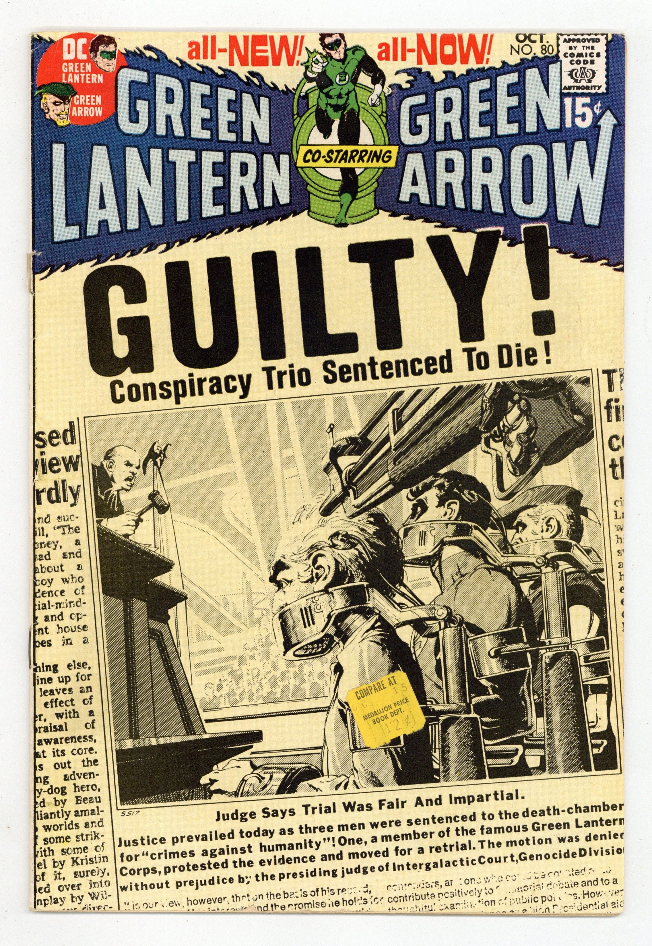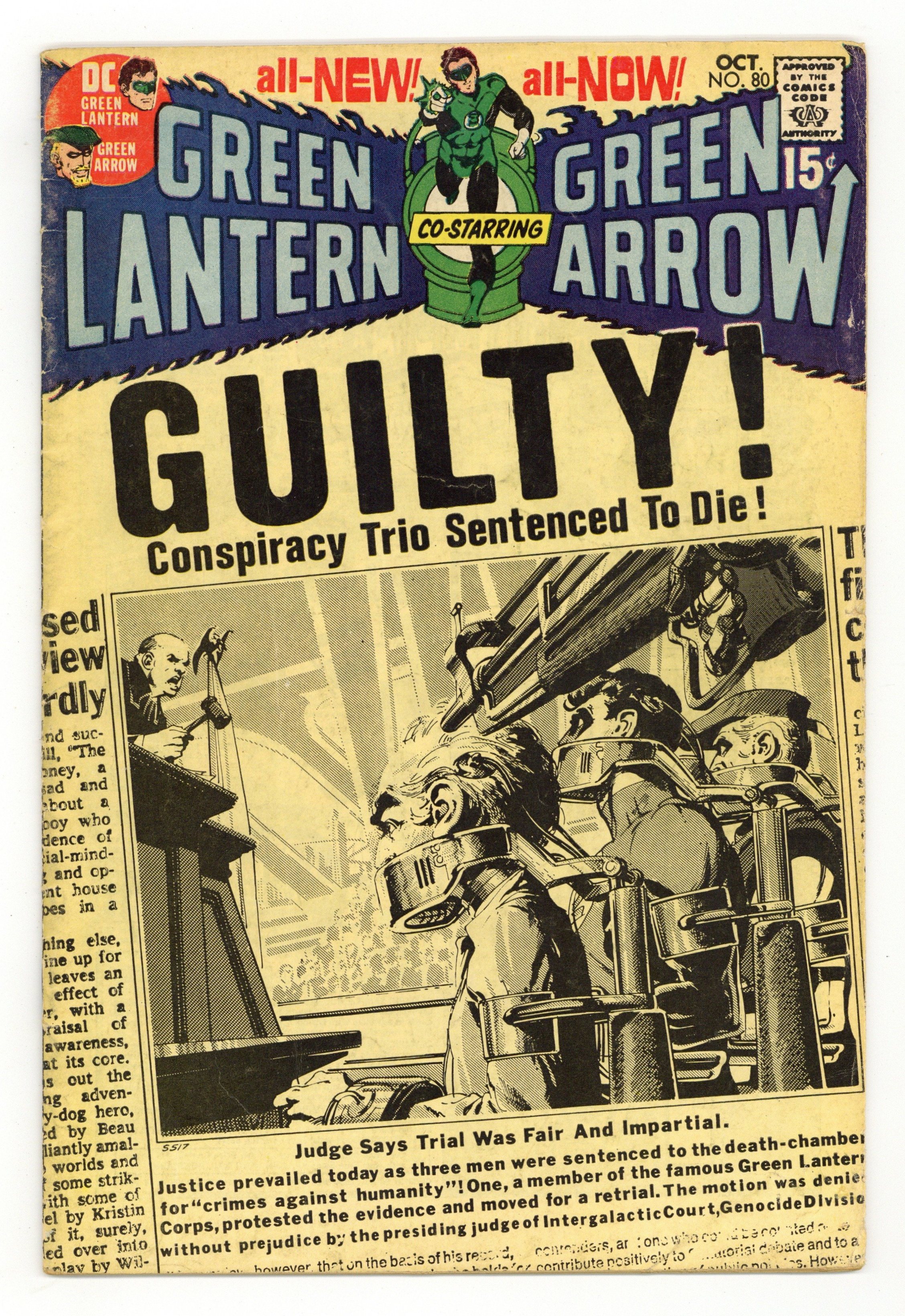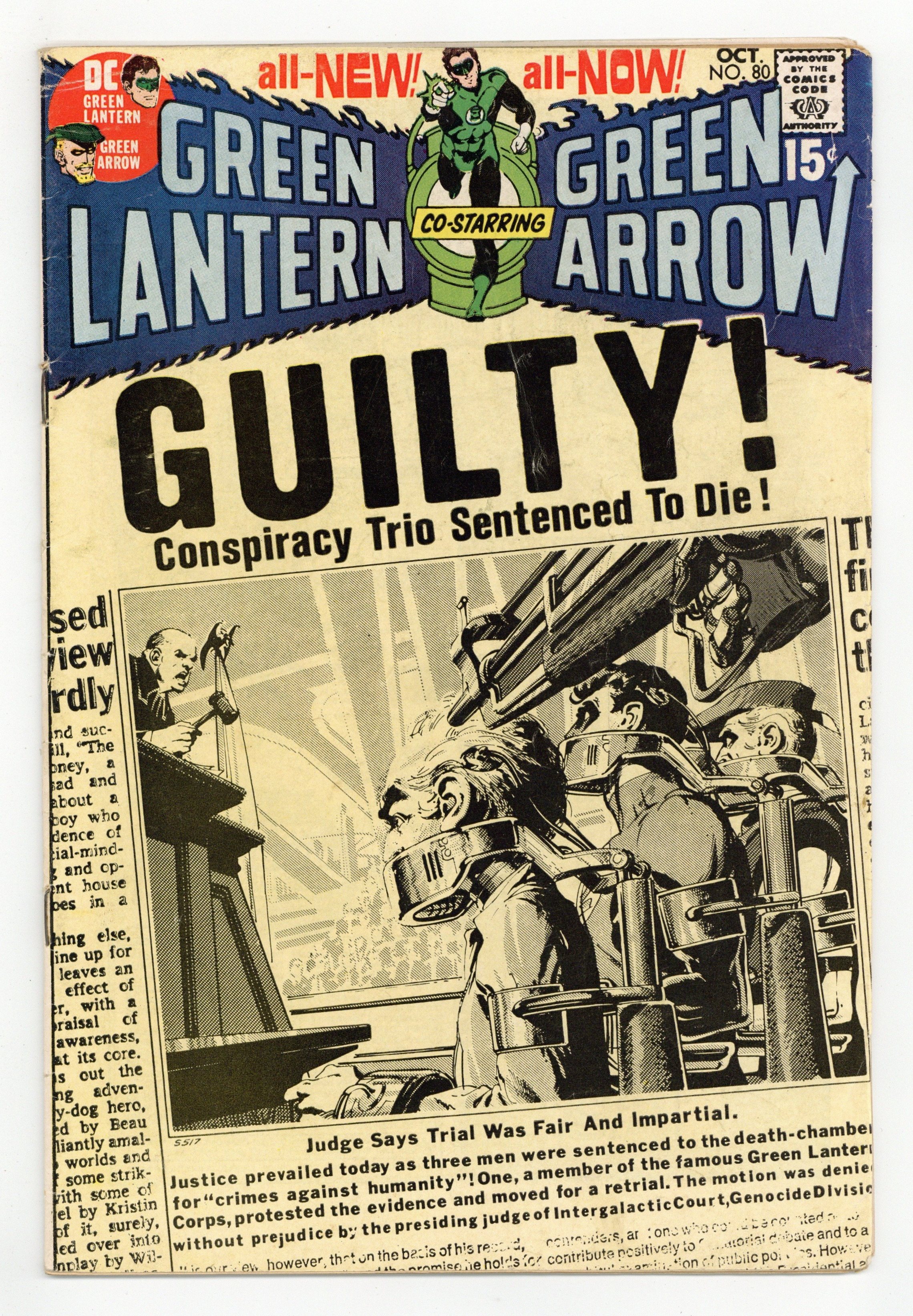 Cover art by Neal Adams. Even an Immortal Can Die!, script by Denny O'Neil, pencils by Neal Adams, inks by Dick Giordano and Mike Peppe (some incomplete figures); For putting the welfare of Green Lantern ahead of the ecological welfare of the planet Earth, the Guardians of the Universe send Old-Timer, accompanied by Green Lantern and Green Arrow as witnesses, to the planet Gallo to be judged by the Tribune. But when they are all muzzled and the Old-Timer is judged guilty without trial, the heroes realize that something is terribly wrong; They discover that the real Tribune have been replaced by their mechanic and fight to restore the proper process of justice and save the life of the Old-Timer. Letter to the editor from comic writer Don McGregor. 36 pgs. $0.15. Cover price $0.15.