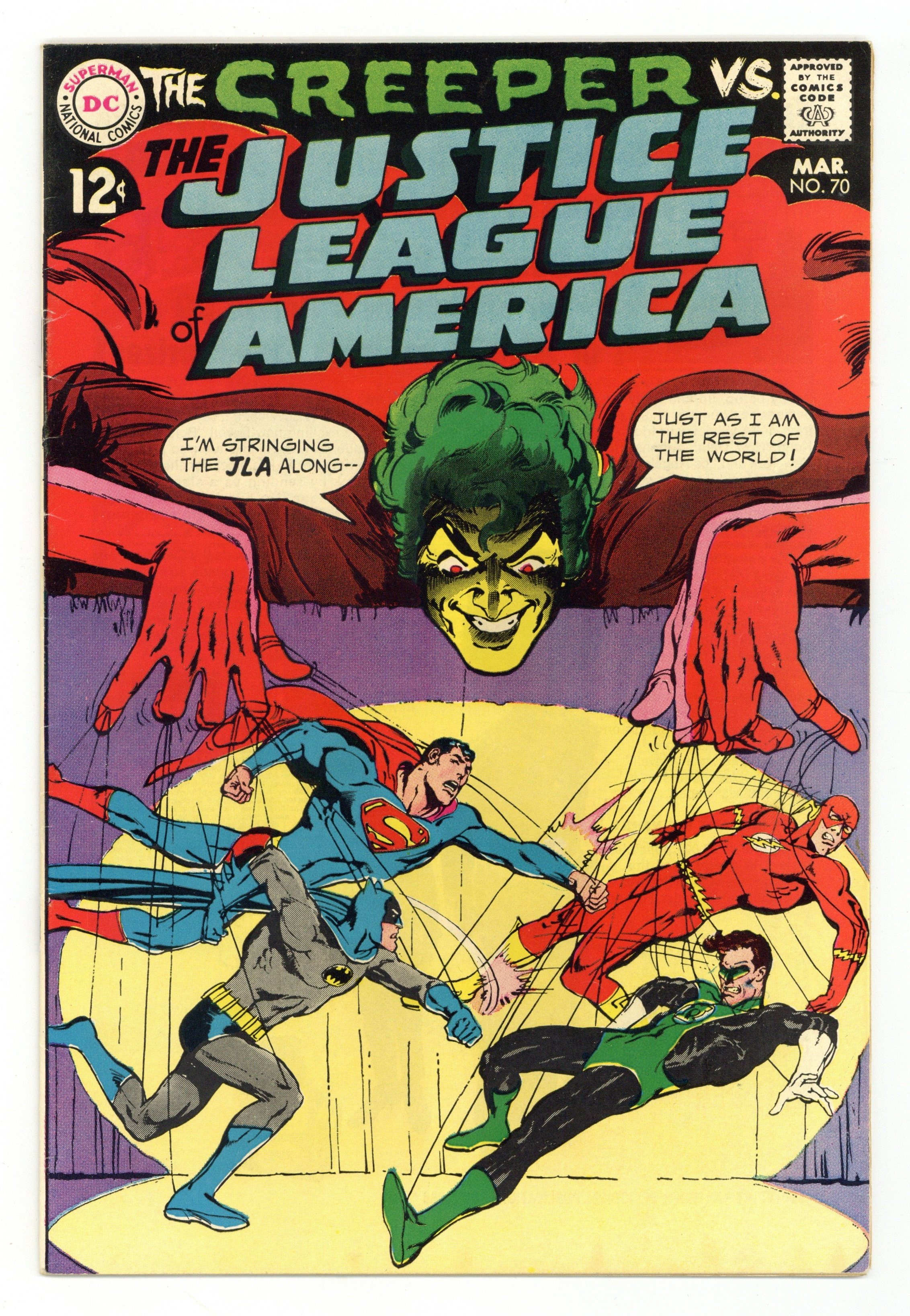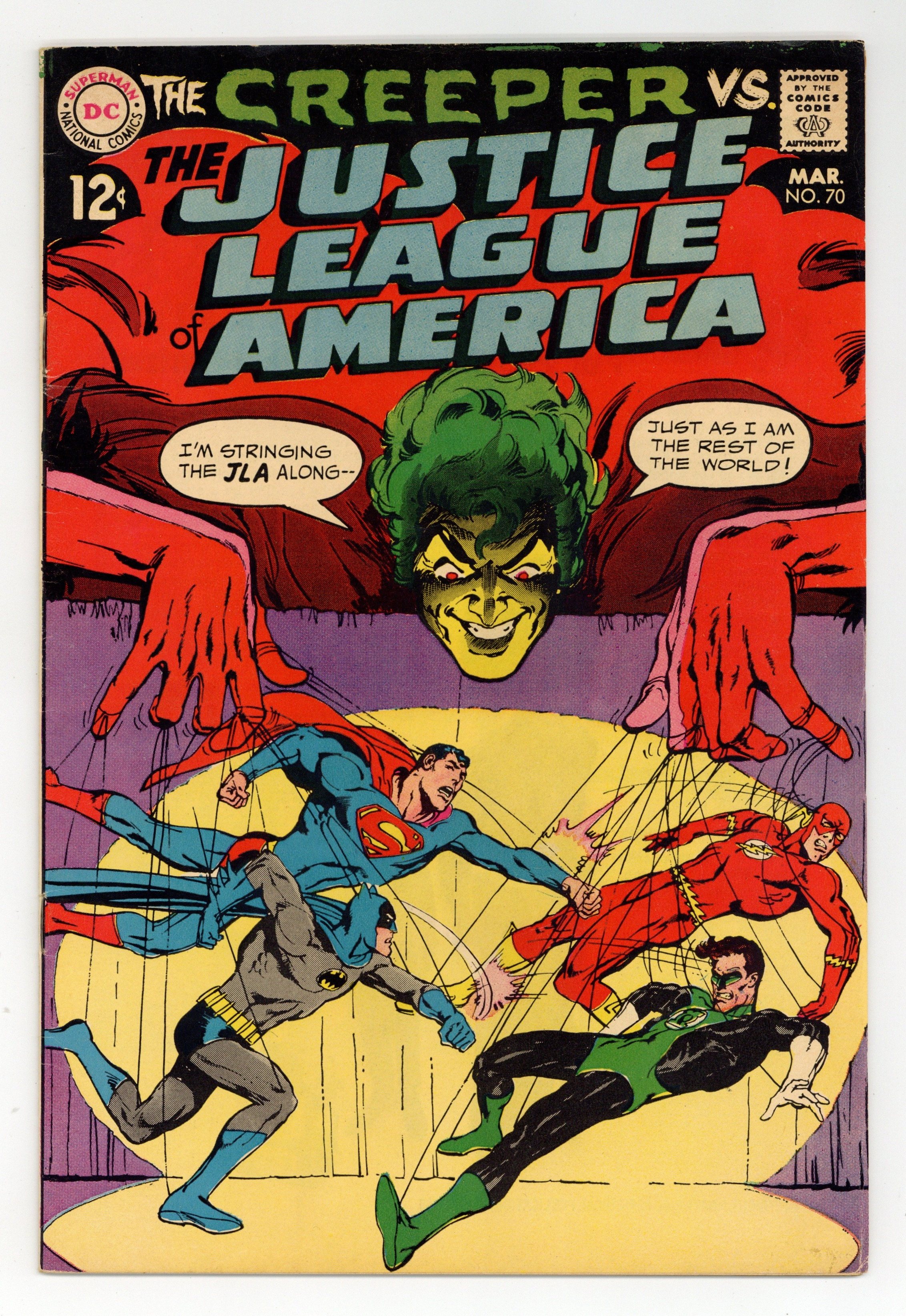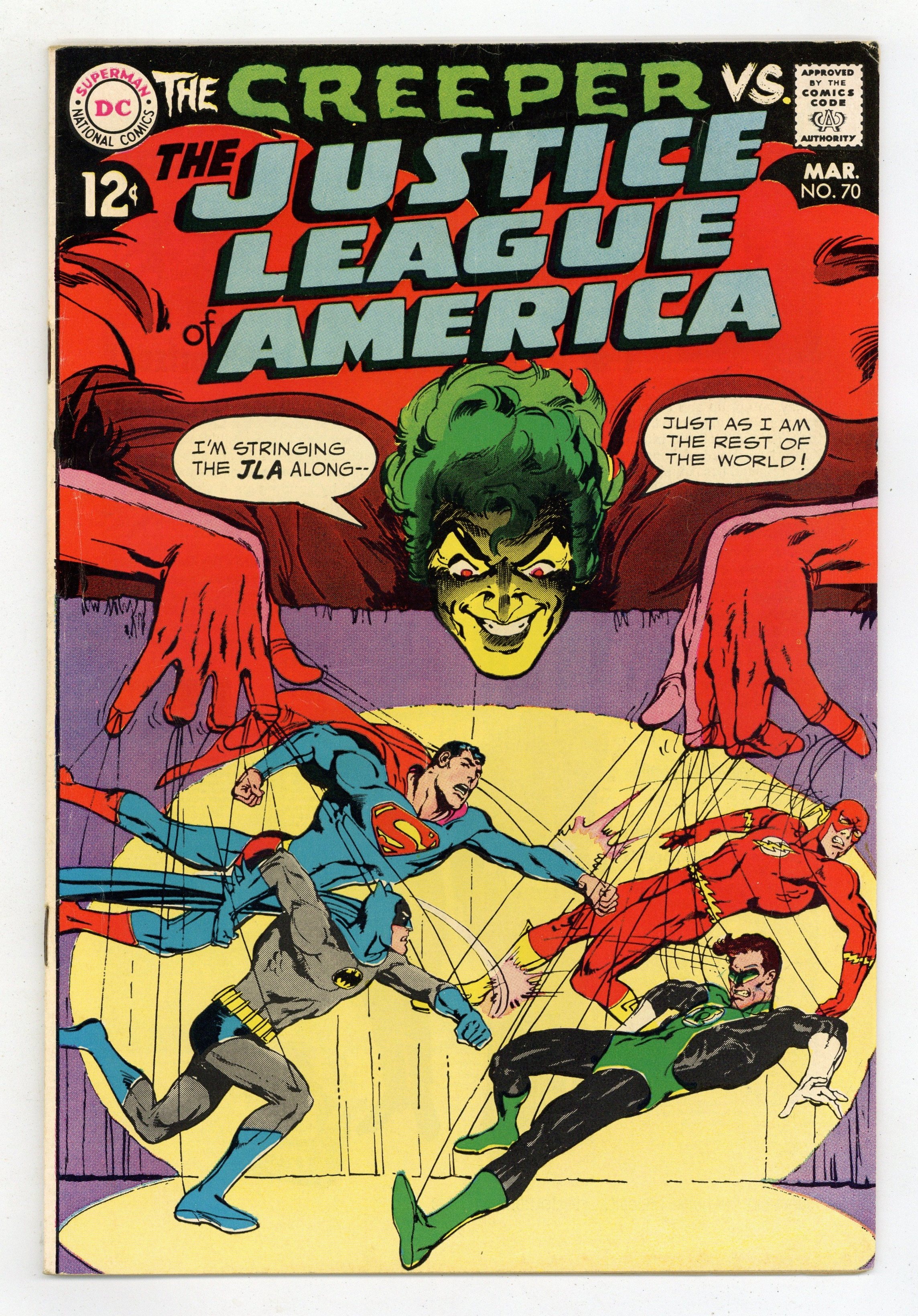 Cover art by Neal Adams. Versus the Creeper, script by Denny O'Neil, pencils by Dick Dillin, inks by Sid Greene; Batman prompts the League to investigate the new crime fighter, the Creeper; aliens, crooks, the Creeper, and the League battle at a nuclear power plant. Statement of ownerhsip--average print run 537,000; average paid circulation 315,500. 36 pgs. $0.12. Cover price $0.12.