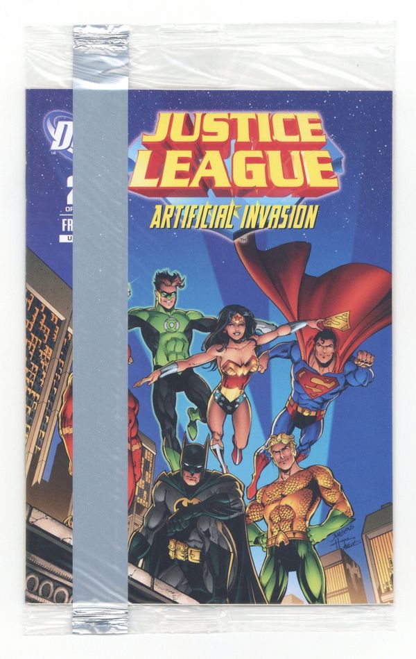 $8.00"Artificial Invasion" A mysterious robotic horde is menacing Metropolis and even the combined powers of the Justice League cannot halt their sheer numbers. How can Superman and Wonder Woman prevail when facing such an implacable foe? This promotional Justice League comic was packaged inside specially marked boxes of General Mills cereals. 5"x7" FC. Comic is still in original poly bag.
