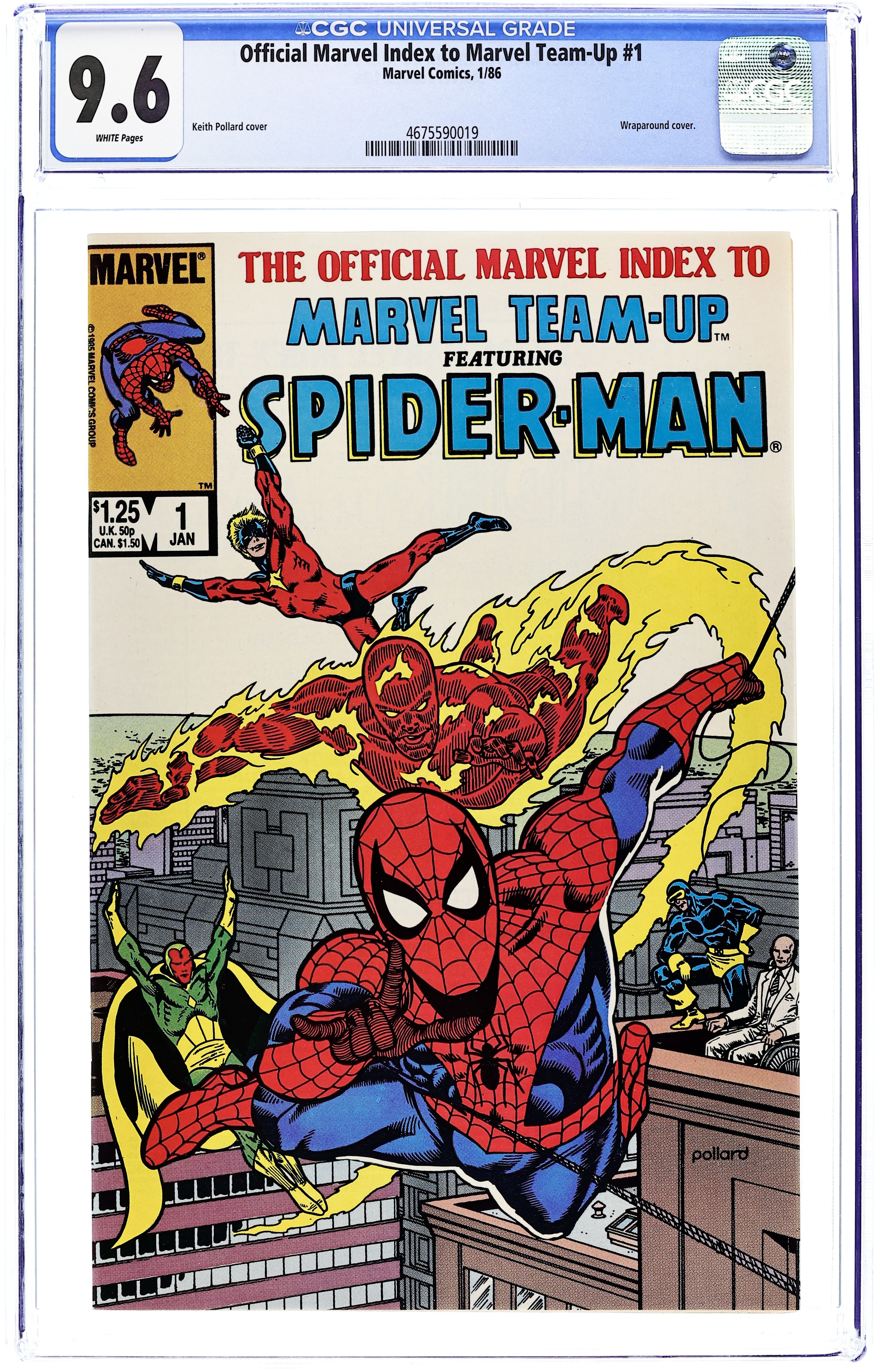 This issue covers Marvel Team-Up 1 thru 20. Each issue reviewed in the index has a one-and-a-half page summary and a reduced-size reprint of the original cover. Index contributors and consultants include George Olshevsky, Peter Garcia, Chuck Huber, Dennis Mallonee, Lou Mougin, Murray Ward, Mark Gruenwald, and Peter Sanderson. Cover by Keith Pollard. The wraparound cover portrays Spider-Man and the super-heroes he teamed up with in the first twenty issues. The Black Panther, Captain America, Doctor Strange, Hulk, Iceman, Mister Fantastic, Sub-Mariner, and the Thing are shown on the back side. The splash page features an essay on the history of the Marvel-Team Up title and a reduced-size version of the splash page from Marvel Team-Up 1. The back inside cover describes the plan and purpose for the Marvel Index series. (Notes: There are six issues in the Marvel Team-Up Index. There are not any ads in the index issues.) 32 pages Cover price $1.25.